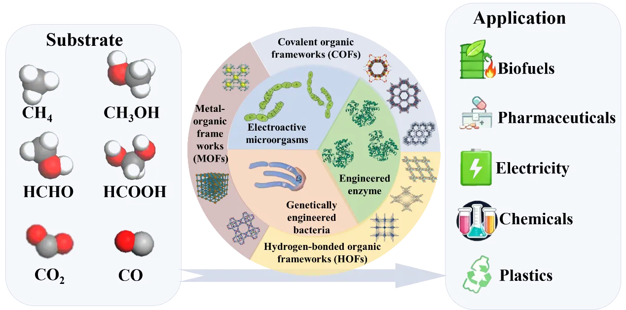 The bioconversion of C1 compounds (CO2, methane, methanol, etc.) constitutes a crucial pathway for green biomanufacturing. However, the process efficiency is constrained by several challenges, including the difficult capture of gaseous substrates, instability of biocatalysts, and the high cost as well as operational complexity of cofactor regeneration. Porous framework materials offer promising solutions due to their high specific surface area, tunable pore structures, and ease of functionalization. This review provides a systematic and forward-looking analysis that moves beyond the conventional view of porous frameworks as simple immobilization matrices. We distinctly highlight their emerging multifunctional and integrative roles in C1 bioconversion, emphasizing several novel strategic contributions: (1) Serving as intelligent immobilization carriers that not only enhance biocatalyst stability and recyclability but also concurrently enable efficient C1 substrate enrichment and localized concentration; (2) Facilitating synergistic energy conversion by interfacing with photocatalysis or electrocatalysis to enable in-situ and sustainable cofactor regeneration, thereby addressing a key economic bottleneck; (3) Actively regulating microbial metabolism and community dynamics through tailored material-microbe interactions, optimizing carbon flux and system resilience; and (4) Mimicking natural enzymes to create robust and tunable biomimetic catalysts for C1 conversion under non-physiological conditions. Remaining challenges, such as mass transfer limitations, the scalability of material synthesis, and the integration of hybrid systems, are analyzed through the lens of these advanced functionalities. We conclude that the synergistic and rational integration of synthetic biology-designed biocatalysts with engineered multifunctional frameworks represents a paradigm shift, paving the way for efficient, stable, and high-value utilization of C1 resources.