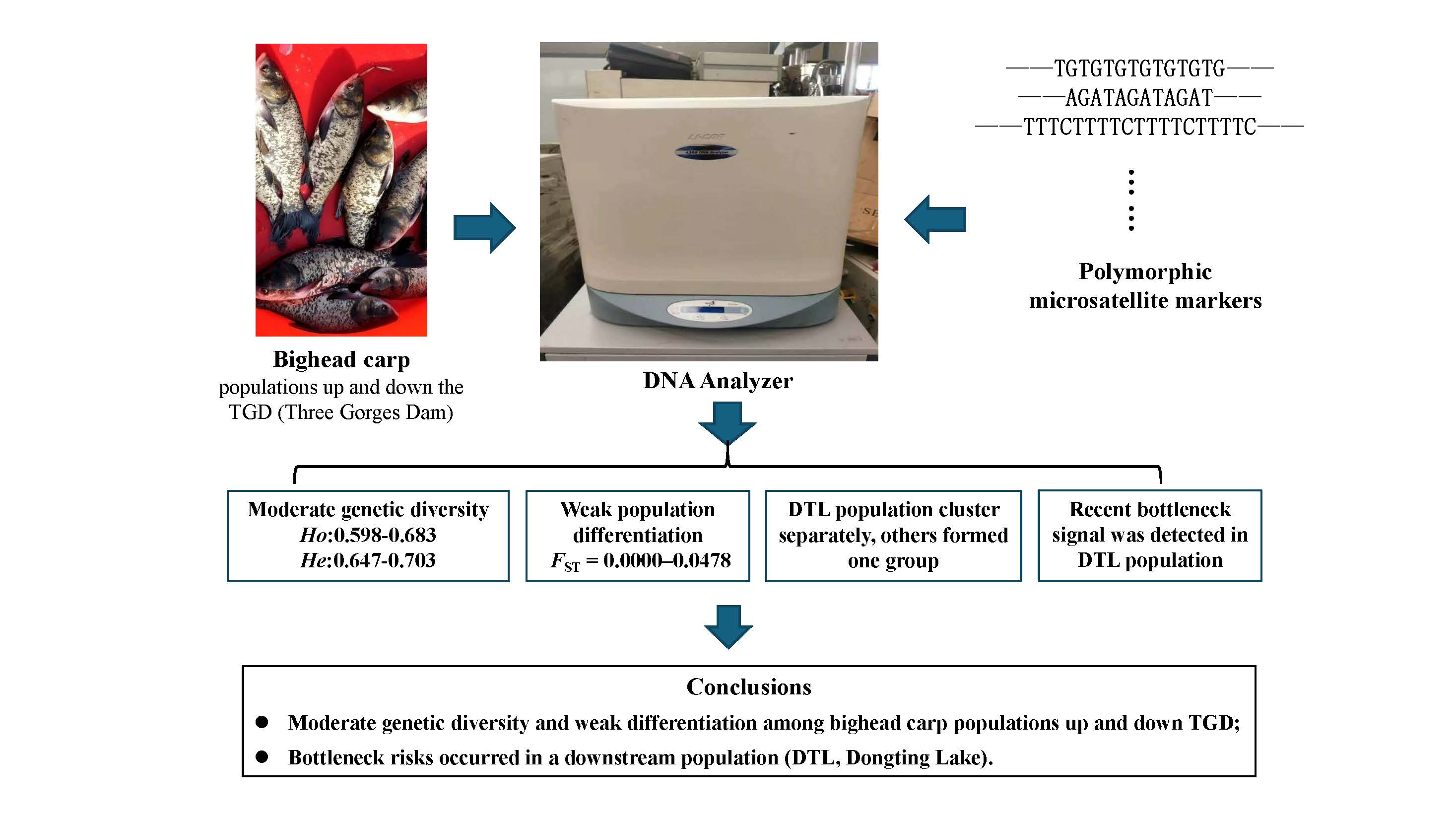 Bighead carp (Hypophthalmichthys nobilis) has an essential role in freshwater fisheries worldwide, especially in China, yet its germplasm resources in the upstream Yangtze River have been scarcely studied. We used nine polymorphic microsatellite markers to assess genetic diversity and differentiation in seven bighead carp populations from the upper-middle Yangtze River. In five populations from the upstream and two populations from the midstream of the Yangtze River, a total of 101 alleles were detected, with the mean value of alleles per population varying from 5.3 to 8.4. Moderate genetic diversity of seven populations was detected with the values of Ho, He and PIC ranging from 0.598 to 0.683, 0.647 to 0.703 and 0.591 to 0.639, respectively. Weak population differentiations (Fst = 0.0000–0.0478) were observed, which indicated that bighead carp populations up and down the Three Gorges Dam (TGD) could be regarded as a group. Structure and clustering analysis consistently supported that the bighead carp samples examined in this study were clustered as one group, except a population from Dongting Lake (DTL), the second largest lake of China, in the midstream of the Yangtze River. This study provided evidence of moderate genetic diversity and weak differentiation among bighead carp populations from upstream and midstream regions of the Yangtze River, suggesting that the TGD has not yet had a significant influence on population genetic structure. These results are valuable for conservation genetics and sustainable utilization of bighead carp resources in the Yangtze River.