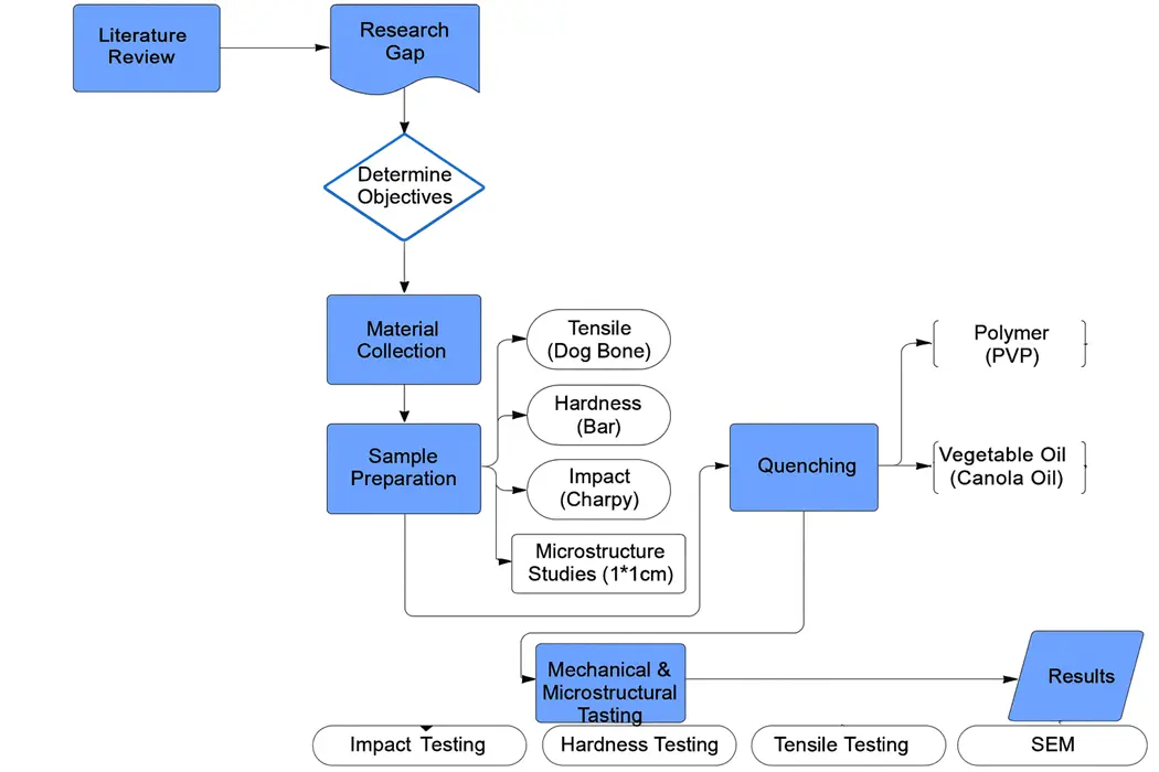 Steel is an essential component used to build marine vessels due to its endurance of the sea’s harsh conditions, including corrosion and dynamic stresses, therefore, different grades of mild steel are used in shipbuilding. It provides the strength, ductility, and weldability necessary for structural integrity, consisting of carbon, manganese, etc., as alloying elements. In this research, different quenching media were employed to assess variations in mechanical properties. This process ultimately triggered alterations in the microstructure of the steel. Two types of media, such as vegetable oil (Canola) and Polyvinylpyrrolidone polymer (PVP), were studied in comparison with simple heat-treated steel. Mechanical characterization comprised of tensile testing, hardness and impact testing to evaluate major changes in strength and ductility. Furthermore, a microscope was used to interpret the microstructure. To guarantee consistency in testing, samples were prepared in accordance with ASTM guidelines. The yield strength of as-received steel was increased from 298 MPa to 358 MPa and 370 MPa because of rapid cooling action in PVP and oil, respectively. A significant increase in Ultimate tensile strength was achieved due to the variety of quenching media; however, ductility was seriously compromised because of the excessive hardness of the material. Impact energy analysis revealed a notable reduction, which is linked with degradation in toughness.