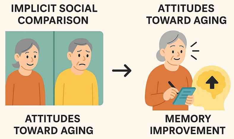 Previous studies have consistently demonstrated that positive attitudes toward aging are associated with better psychological well-being and cognitive performance among older adults. Building upon these findings, the present study focused on memory improvement as a direct indicator of cognitive benefit derived from more positive self-perceptions of aging. Specifically, we examined whether an implicit social comparison manipulation could enhance older adults’ memory performance by altering their attitudes toward aging. A total of 161 community-dwelling older adults (M = 66.88 years) were randomly assigned to one of five conditions: Better-self (downward comparison), Worse-self (upward comparison), Equal-good, Equal-bad, and Control. In four experimental conditions, an adopted directed-thinking task was used to activate attitudes toward one’s own and peers’ aging in different combinations, implicitly triggering upward or downward social comparisons. Attitude toward own aging (ATOA), attitude toward peers’ aging (ATPA), self-superiority (ATOA–ATPA), and memory performance were assessed before and after the manipulation. Results showed that significant changes in self-superiority were found only under the two contrast conditions. Specifically, self-superiority increased in the Better-self group and decreased in the Worse-self group. Moreover, the Better-self group demonstrated greater memory gains than the Control and Worse-self groups. These findings suggest that implicit downward comparison can serve as an effective, non-defensive strategy to strengthen older adults’ self-perceptions of aging and to produce short-term improvements in memory. The study extends prior research on social comparison in old age by linking its psychological and cognitive effects within a single experimental framework.