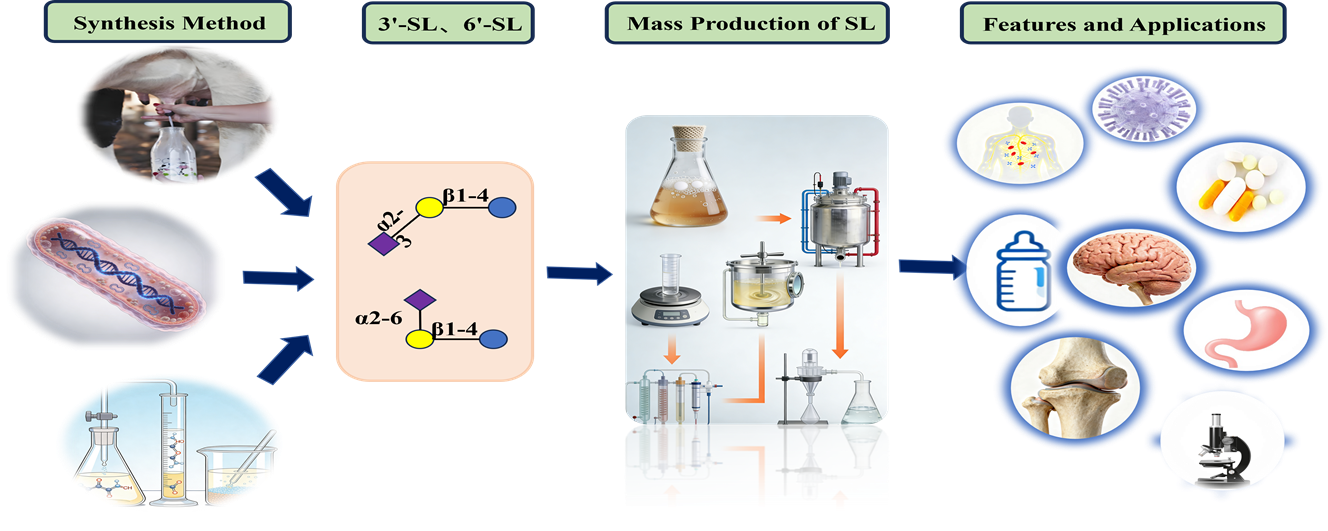 Human milk oligosaccharides (HMOs), the third most abundant solid component in human milk after lactose and lipids, are recognized as crucial prebiotics that support infant gut health and immune development. Salivary HMOs account for approximately 13% of the total HMOs molar ratio, with 3′-sialyllactose (3′-SL) and 6′-sialyllactose (6′-SL) accounting for approximately 2% and 6%, respectively. Sialyllactose (SL) exhibits a range of notable physiological functions, including prebiotic activity, antiviral properties, prevention of necrotizing enterocolitis, immunomodulatory effects, and enhancement of brain development and cognition. Both 3′-SL and 6′-SL have been approved as “Generally Recognized as Safe” (GRAS) by the U.S. FDA and are increasingly incorporated into infant formula. Currently, the biosynthesis of SL is mainly efficiently produced through engineered microorganisms. However, face bottlenecks: low yields, complex downstream processing, and prohibitive costs. Recent advances in synthetic biology and metabolic engineering offer promising avenues to overcome these barriers. This review introduces the synthesis methods, functions, and applications of SL, as well as conducting safety evaluation and regulatory status analysis. We hope this article will enhance understanding of the challenges encountered in the synthetic biology production and application of SL.