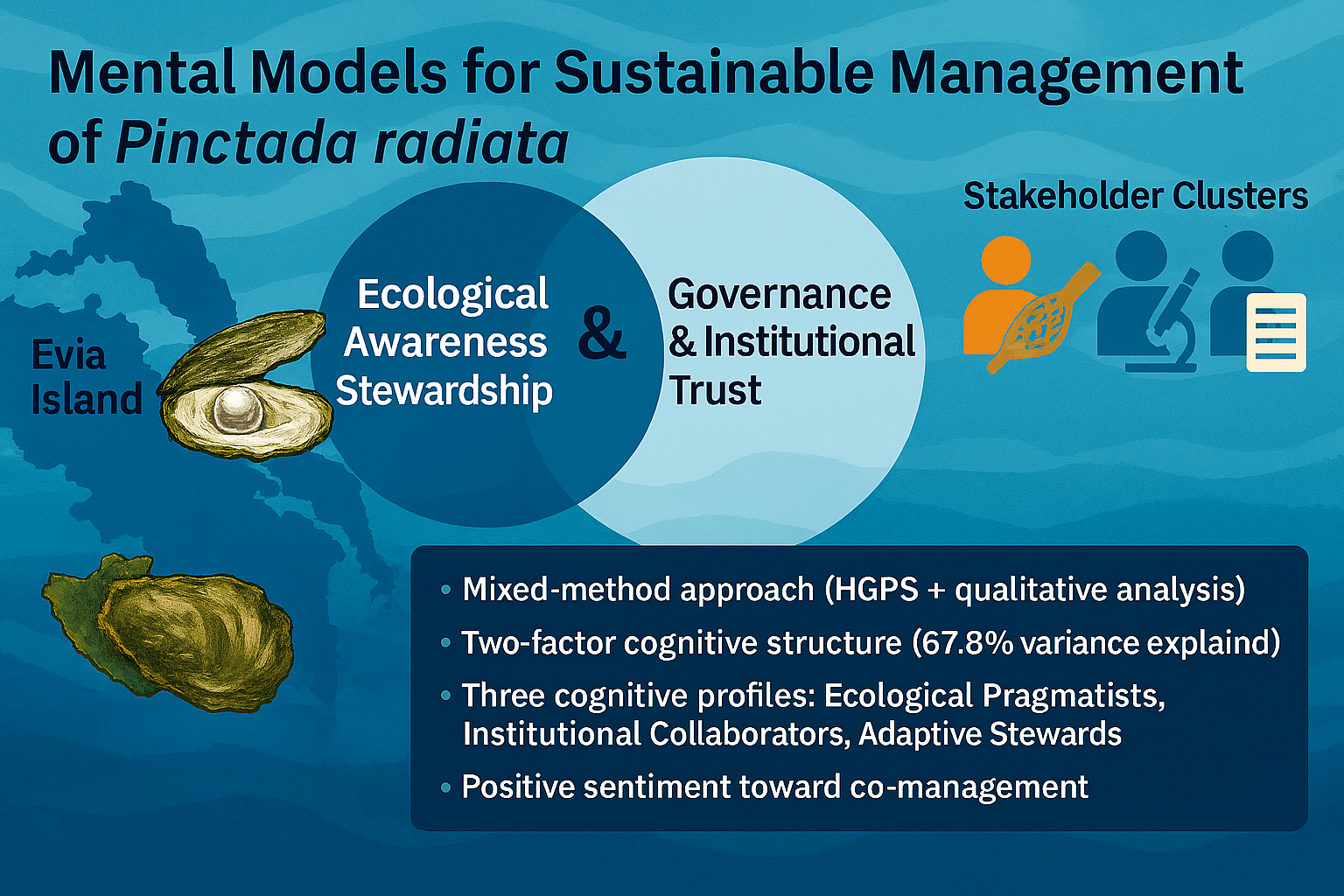 Sustainable management of marine and coastal systems depends not only on ecological dynamics but also on the ways stakeholders perceive and interpret them. This study investigates how fishers, scientists, and government officials understand and frame the management of the Indo-Pacific pearl oyster Pinctada radiata, a non-native yet economically valuable species established around Evia Island, Greece. Using a mixed-methods approach (N = 80), we combined an eleven-item Hydro-ecological Governance Perception Scale (HGPS) with open-ended responses to explore cognitive patterns and governance perspectives. Sampling adequacy was satisfactory (KMO = 0.74; Bartlett’s χ2(55) = 350.41, p < 0.001) and factor analysis revealed two interrelated dimensions explaining 67.8% of total variance (α = 0.84; ω = 0.86; CR = 0.82). Although Kruskal–Wallis tests showed no statistically significant differences among groups (p > 0.05), hierarchical clustering distinguished three partially overlapping cognitive profiles: Ecological Pragmatists, Institutional Collaborators, and Adaptive Stewards (Silhouette = 0.45; CH = 150.23; DBI = 0.75). Thematic and sentiment analyses underscored the importance of collaboration, transparency, and education (mean sentiment = 0.58). The findings demonstrate how cognitive diversity can improve hydro-ecological resilience and the sustainability of coastal governance when it is mobilized through co-management and participatory monitoring.