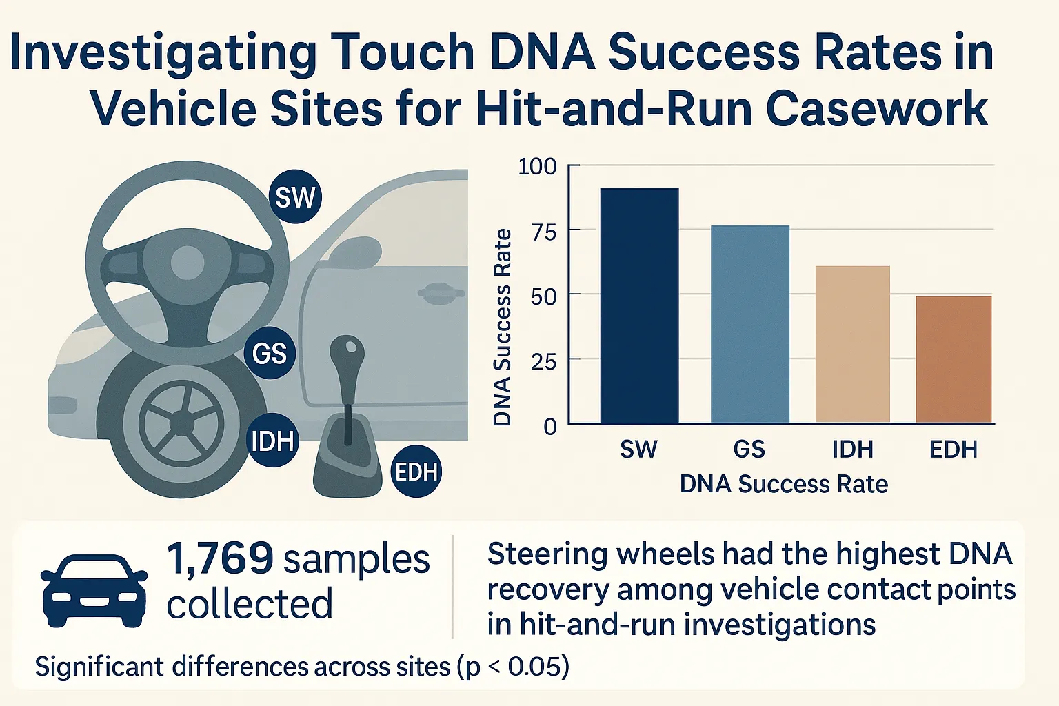 This study evaluated the effectiveness of Touch DNA recovery from four key vehicle contact points—steering wheel (SW), gear shift (GS), interior door handle (IDH), and exterior door handle (EDH)—in the context of hit-and-run forensic casework. 1769 samples were collected from 359 vehicles processed between 2020 and 2023. Statistically significant differences were observed in the quantity and quality of DNA recovered across these sites (p < 0.05). The steering wheel yielded the highest DNA success rates, followed by the gear shift, whereas the exterior and interior door handles demonstrated substantially lower recovery efficiency. These findings underscore the critical role of strategic sampling site selection in maximizing evidentiary outcomes. The results support prioritizing the steering wheel and gear shift as primary targets for DNA collection in vehicle-based investigations. The study highlights the practical utility of Touch DNA in linking individuals to vehicular crimes and calls for further research into alternative sampling techniques and contamination control measures to optimize forensic DNA recovery protocols in real-world hit-and-run scenarios.