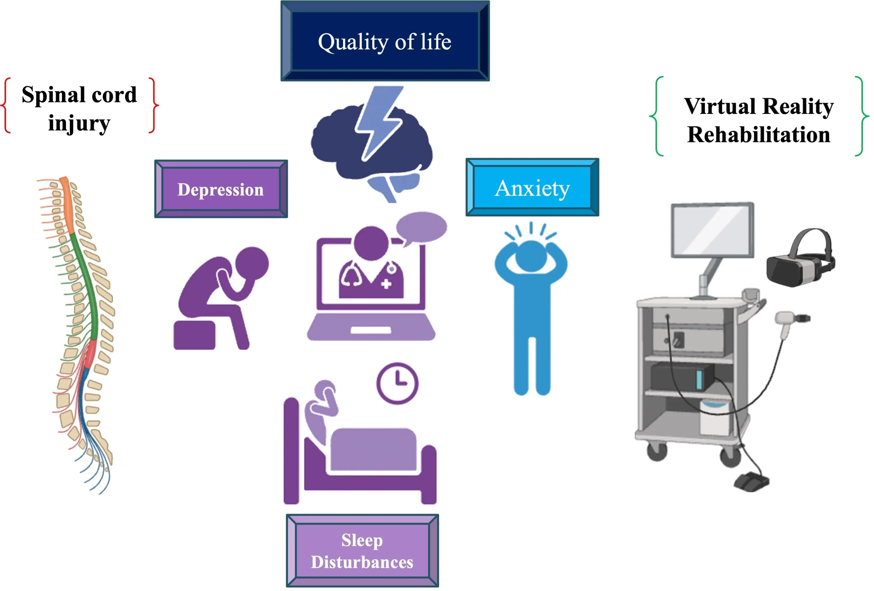 This randomized controlled trial investigates the effects of virtual reality (VR) rehabilitation on mental health in spinal cord injury (SCI) patients. Seventy-four participants were randomized to 12 weeks of VR-based or traditional rehabilitation, with mental health assessed via the Hospital Anxiety and Depression Scale (HADS) and World Health Organization Quality of Life-BREF (WHOQOL-BREF). The VR group showed significantly greater reductions in HADS scores at 6 weeks (mean change: −4.2 vs. −2.4, p < 0.001) and 12 weeks (mean change: −6.4 vs. −3.9, p < 0.001), with a large effect size (Cohen’s d = 1.21). VR also improved WHOQOL-BREF psychological health scores (+13.5 vs. +6.4, p < 0.001), self-esteem (+7.2 vs. +3.2, p < 0.001), and sleep quality (−5.1 vs. −2.8, p < 0.001). Subgroup analysis indicated greater benefits for younger patients and those with incomplete SCI. VR rehabilitation outperforms traditional methods in enhancing mental health, supporting its integration into comprehensive SCI care.