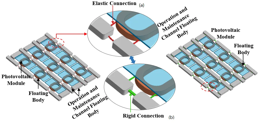 Offshore Floating Photovoltaic structure (OFPV) represents a promising solar energy technology characterized by high conversion efficiency and suitability for large-scale deployment. However, the safety and economic synergy problems of floating structures restrict the industrialization and large-scale development of OFPV. We propose a novel OFPV with elastic connection and modularizable HDPE float blocks. The numerical wave tank is established by the turbulence model in FLOE-3D, based on the Navier-Stokes equations. Hydrodynamic analysis of the OFPV is conducted by using the Generalized Mode-Order (GMO) approach. Furthermore, the dynamic responses and mooring loads of the OFPV with elastic and rigid connections are compared. The results show that the average pressure of the photovoltaic support structure with the elastic connection is positively correlated with the wave height. The tension value of the elastic cable is higher at the outermost peak tension. The OFPV with the elastic connection structure has more obvious advantages in extreme wave state conditions than the rigid connection. This study provides theoretical support for the design and engineering application of OFPV.