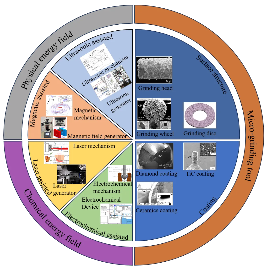 Hard, brittle and difficult-to-machine materials are prone to surface cracks, subsurface damage and other defects in the traditional grinding process, accompanied by low processing efficiency and severe tool wear. As a new type of processing technology, energy field-assisted grinding provides a new approach for the efficient and high-quality processing of hard and brittle materials. This paper reviews the latest research progress of muti-energy field-assisted grinding from aspects such as the types and selection of grinding tools, processing equipment and physical-chemical coupled mechanisms. Firstly, micro-grinding tools are classified based on different surface structures and coating materials, with the aim to enhance processing efficiency, improve the surface quality and geometric accuracy of workpieces, and reduce tool wear. Secondly, the processing mechanisms, parameter selection and current difficulties faced by four energy field-assisted grinding methods, including laser-assisted grinding, electrochemical-assisted grinding, magnetic-assisted grinding and ultrasonic field-assisted grinding, are discussed under both chemical and physical effects. Thirdly, different equipment and auxiliary devices developed for energy field-assisted grinding have been introduced, providing reliable platforms for the distribution design and efficient regulation of the energy field. Finally, the cutting-edge progress, main challenges and development trends of energy field-assisted grinding are prospected, illustrating the great potential of this technology in fields such as aerospace, electronics, and optical components.