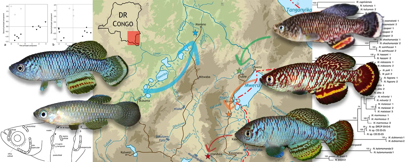 The cyprinodontiform fish fauna of the Bangweulu–Mweru and Upper Lualaba freshwater ecoregions, situated in the uppermost Congo River drainage, has been reviewed. This study introduces four newly described species of seasonal Nothobranchius killifish and a novel species of lampeye belonging to the genus ‘Lacustricola’. Nothobranchius iridescens, new species, from the Kafila system in the Lufira drainage, is characterized in male colouration by anal fin with irregular red-brown spots and stripes, creating two irregular submedial and medial bands and with broad yellow subdistal band; and a caudal fin with a slender light blue subdistal band, densely marked with irregular red spots, and narrow dark brown distinct distal margin. Nothobranchius katemomandai, new species, from the Kay system in the upper Lualaba drainage, is characterized in male colouration by an anal fin with narrow brown submedial band, followed by a slender yellow band, a slender red-brown band and a slender dark brown distal band; and a caudal fin with brown spots proximally and medially, and with slender white to light blue subdistal band and a narrow dark grey distal band. Nothobranchius marmoreus, new species, from the Lufukwe system in the Lake Mweru basin, is characterized in male colouration by a body with irregular red-brown patches and stripes, forming a marble-like mottled pattern; and anal and caudal fins with slender yellow to amber subdistal band and broad dark brown distal band. Nothobranchius dubieensis, new species, from the Lubule system in the Luvua drainage, is characterized in male colouration by an anal fin with narrow dark brown submedial band, narrow yellow and orange medial bands, narrow white subdistal band, and slender dark brown distal band; and a caudal fin with irregular red-brown spots and stripes proximally and medially, followed by an irregular narrow red-brown subdistal band and slender white distal band, and with interrupted red-brown fin tips. ‘Lacustricola’ gemma, new species, from the Kay system in the upper Lualaba drainage, is characterized by a pattern of iridescent, diamond-shaped, light blue spots in scale centres below mid-longitudinal series on posteroventral portion of flank; median fins yellow to hyaline, with dark grey stripes perpendicular to fin rays; dorsal fin with light blue distinct margin; anal fin with dark grey margin. Analysis of mitochondrial COI gene sequences revealed that the five new species represent phylogenetically distinct lineages. These findings not only underscore their genetic uniqueness but also confirm their placement within the Nothobranchius brieni species group and the genus ‘Lacustricola’. Species of the genus Nothobranchius complete their seasonal life cycle in ephemeral natural habitats within freshwater wetlands, while ‘Lacustricola’ species migrate to breed in flooded areas of shallow, typically seasonal wetland habitats at the onset of the rainy season. These wetlands are highly vulnerable to a variety of human-induced stressors and threats, including agricultural cultivation, water extraction, urban expansion resulting in land-use pressure, and increased pollution, particularly from industrial activities such as mining. Therefore, it is essential to protect the integrity of these unique aquatic habitats throughout all the seasons of the year to maintain healthy wetland ecosystems and safeguard the distinctive seasonal freshwater biodiversity they support.