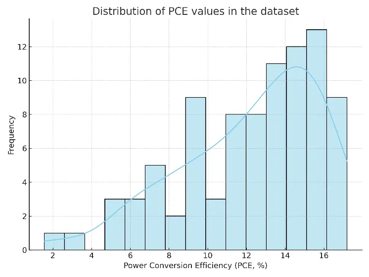 This study forecasts the power conversion efficiency (PCE) of organic solar cells using data from experiments with donors and non-fullerene acceptor materials. We built a dataset that includes both numerical and categorical features by using standard scaling and one-hot encoding. We developed and compared several machine learning (ML) models, including multilayer perceptron, random forest, XGBoost, multiple linear regression, and partial least squares. The modified XGBoost model performed best, achieving a root mean squared error (RMSE) of 0.564, a mean absolute error (MAE) of 0.446, and a coefficient of determination (R2) of 0.980 on the test set. We also assessed the model’s ability to generalize and its reliability by examining learning curve trends, calibration curve analysis, and residual distribution. Plots of feature correlation and permutation importance showed that ionization potential and electron affinity were key predictors. The results demonstrate that with proper tuning, gradient boosting methods can provide highly accurate and easy-to-understand predictions of organic solar cell efficiency. This work establishes a repeatable machine learning process to quickly screen and thoughtfully design high-efficiency photovoltaic materials.