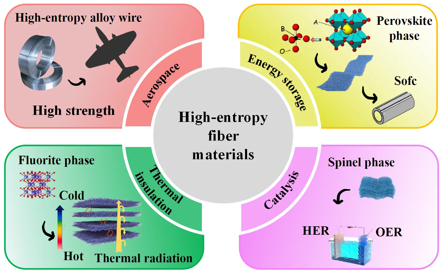 Due to their lightweight, high strength, and thermal resistance, HEFMs exhibited significant potential in aerospace, energy storage, environmental protection, and defense. This review systematically presented the research progress on high-entropy fibrous materials (HEFMs), covering their fundamental concepts, fabrication methods, crystal structure characteristics, performance advantages, and application fields. The different crystal structure types and fabrication techniques of high-entropy ceramic fibers and high-entropy alloy fibers were discussed. Additionally, the mechanical property advantages of HEFMs and their applications in thermal insulation materials, catalysis, and energy storage were analyzed. Finally, the current challenges in HEFM research and provide an outlook on future development directions.