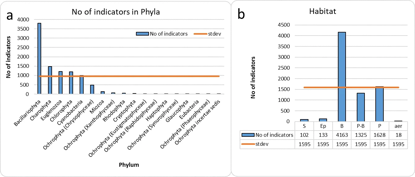 Accumulation of ecological data on species of algae and cyanobacteria represents 9531 taxa-indicators from 18 taxonomic phyla. The most represented among the indicators is the taxonomic group of diatoms. The indicators are grouped into twelve ecological groups, which can be indicators of nine environmental parameters. The environmental characteristics for each of the indicator systems and the relationship between some of them are given. Individual abbreviations of ecological indicator groups that have been established as a result of long-term use are given. References are given to examples of the application of analysis of specific water bodies using bioindication methods, and prospects for use in monitoring and assessing water quality are shown. A specific example of using the database is given. The table of indicator taxa contains cumulative ecological data and is easy to use. This table is a living tool that can be supplemented and transformed when new information about indicator species comes.