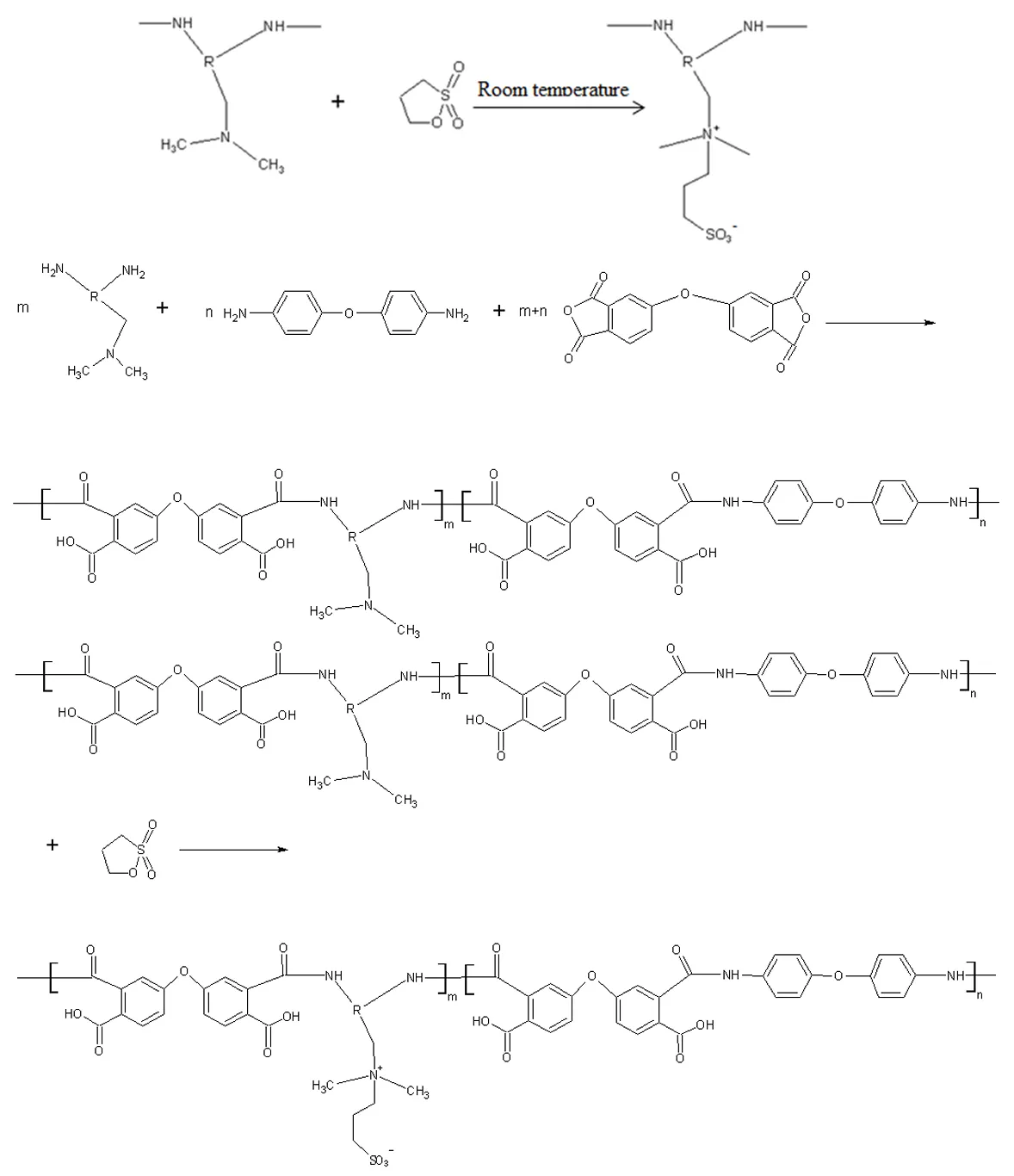 Through the molecular structure design, first starting from the molecular structure of the monomer, the monomer of the synthetic structure continues to polymerize with propanesulfonolactone, and finally reacts with quaternary ammonium salts to obtain polyimide containing biswitterionic groups. In this study, a hydrophilic polyimide membrane with a quaternary ammonium salt structure was synthesized. Then, the sulfonate hydrophilic structure was introduced into the polyimide film by electrospinning and the stencil method. Hydrophilic groups were introduced by introducing propane sulfonate, and the PI membrane was prepared by electrospinning and the template method. The results show that introduced sulfonic acid groups reduce the contact angle of polyimide membrane from 85° to 30°. The water permeability, porosity and mechanical strength of the membrane were tested and analyzed, and the membrane showed excellent oil-water separation performance.