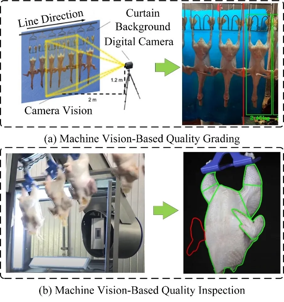With global broiler production reaching 103 million tons in 2024—a 1.5% increase over 2023—the poultry industry continues to grow rapidly. However, traditional broiler segmentation methods struggle to meet modern demands for speed, precision, and adaptability. First, this study proposes an improved lightweight image segmentation algorithm based on YOLOv8-seg and integrates the Segment Anything Model (SAM) for semi-automatic annotation, achieving precise mask segmentation of broiler parts. Subsequently, Key geometric features (e.g., area, perimeter, axes) were extracted using image processing techniques, with enhancements from HSV color transformation, convex hull optimization, and ellipse fitting. Furthermore, Image calibration was applied to convert pixel data to physical dimensions, enabling real-sample validation. Using these features, multiple regression models—including CNNs—were developed for carcass quality prediction. Finally, by analyzing the broiler segmentation process, machine vision techniques were effectively integrated with quality grading algorithms and applied to intelligent broiler segmentation production lines, providing technical support for the intelligent and efficient processing of poultry products. The improved YOLOv8-seg model achieved mAP@0.5:box scores of 99.2% and 99.4%, and the CNN model achieved R2 values of 0.974 (training) and 0.953 (validation). Compared to traditional systems, the intelligent broiler cutting line reduced failure rates by 11.38% and improved operational efficiency by over 3%, offering a reliable solution for automated poultry processing.
