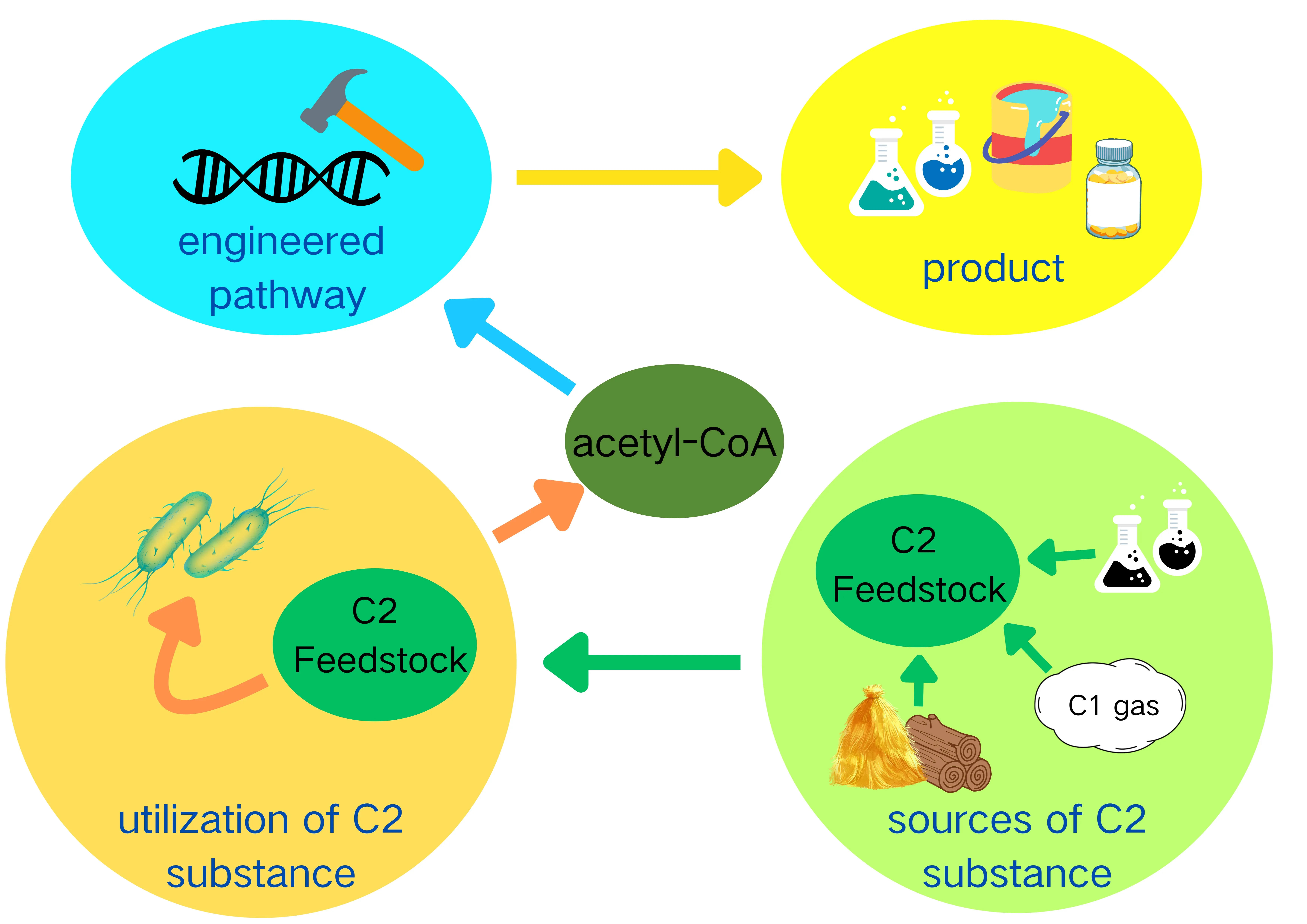 C2 feedstocks have emerged as promising carbon sources for the biological production of various value-added chemicals. Compared to the traditional C6/C5 sugars-contained/constituted feedstocks, C2 feedstocks have diverse and abundant sources, including non-food biomass, industrial by-products, and C1 gases. This diversification not only eliminates competition with human food demands but also aligns with environmental sustainability goals. Moreover, the metabolic route for C2 compounds to enter central carbon metabolism is more direct, which minimizes the carbon loss and enhances the efficiency of bio-based production processes. This review extensively analyzes three prominent C2 chemicals: ethylene glycol, ethanol, and acetate. After introducing the sources of those compounds, it details the metabolic pathways through which they are converted into acetyl-CoA in vivo. Several chemicals produced from these C2 feedstocks in fermentation are also exemplified. Furthermore, different perspectives are proposed to promote the efficient utilization of C2 feedstocks.