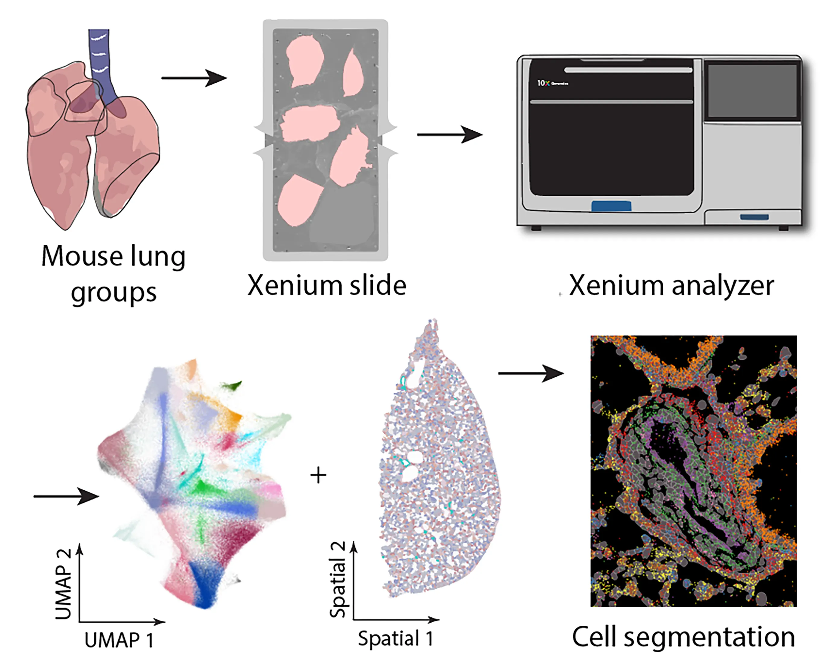 Spatial transcriptomics technologies have emerged as powerful tools for understanding cellular identity and function within the natural spatial context of tissues. Traditional transcriptomics techniques, such as bulk and single-cell RNA sequencing, lose this spatial information, which is critical for addressing many biological questions. Here, we present a protocol for high-resolution spatial transcriptomics using fixed frozen mouse lung sections mounted on 10X Genomics Xenium slides. This method integrates multiplexed fluorescent in situ hybridization (FISH) with high-throughput imaging to reveal the spatial distribution of mRNA molecules in lung tissue sections, allowing detailed analysis of gene expression changes in a mouse model of pulmonary hypertension (PH). We compared two tissue preparation methods, fixed frozen and fresh frozen, for compatibility with the Xenium platform. Our fixed frozen approach, utilizing a free-floating technique to mount thin lung sections onto Xenium slides at room temperature, preserved tissue integrity and maximized the imaging area, resulting in high-fidelity spatial transcriptomics data. Using a predesigned 379-gene mouse panel, we identified 40 major lung cell types. We detected key cellular changes in PH, including an increase in arterial endothelial cells (AECs) and fibroblasts, alongside a reduction in capillary endothelial cells (CAP1 and CAP2). Through differential gene expression analysis, we observed markers of endothelial-to-mesenchymal transition and fibroblast activation in PH lungs. High-resolution spatial mapping further confirmed increased arterialization in the distal microvasculature. These findings underscore the utility of spatial transcriptomics in preserving the native tissue architecture and enhancing our understanding of cellular heterogeneity in disease. Our protocol provides a reliable method for integrating spatial and transcriptomic data using fixed frozen lung tissues, offering significant potential for future studies in complex diseases such as PH.