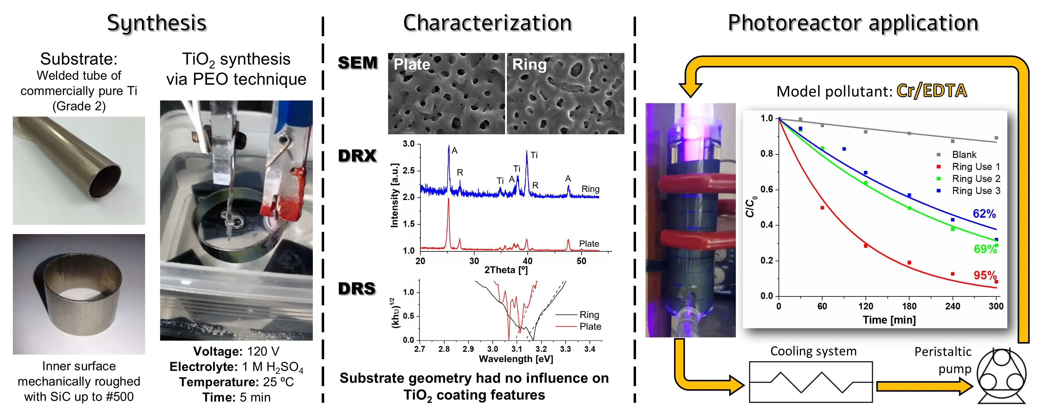 An annular UV photocatalytic reactor with recirculation in batch was designed and built. The design considered low construction, simple operation and maintenance costs, availability and durability of the materials used, easy cleaning, and high standards of hygiene and safety. The TiO2 photocatalysts were synthesized by plasma electrolytic oxidation (PEO) on commercial Ti rings were compared with coatings obtained on Ti plates as a reference, and no influence of the substrate geometry on the morphology, crystallinity, or bandgap of the coatings was observed. The efficiency of the photocatalytic reactor using 10 TiO2-coated rings was tested by Cr(VI) transformation in the presence of EDTA. The Cr(VI) transformation after 5 h irradiation attained 95%; a rather high photocatalytic activity (62%) was maintained after the third use of the rings without reactivation of the photocatalyst. These coatings synthesized by PEO have not been applied in modular photocatalytic reactors until now.