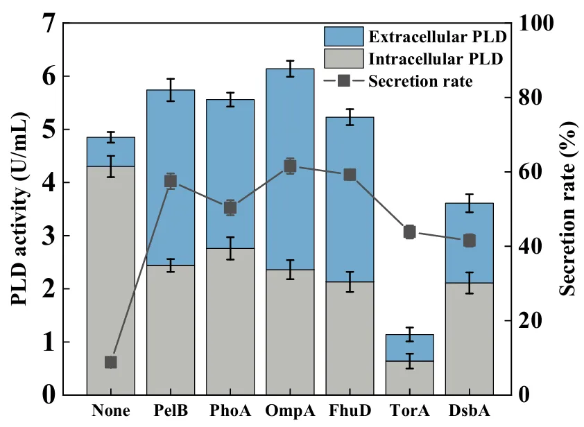 Phospholipase D (PLD) is the key enzyme in the catalytic production of rare phospholipids including phosphatidylserine. It was considered a promising method via genetic manipulation for the heterologous production of PLD in the model chassis. Few works focused on the extracellular production of PLD in engineered microbes. Herein, genetic and process engineering modification strategies were developed to achieve secretory production of PLD in Escherichia coli. The N-terminal fusion secretion signal peptide OmpA and the plasmid pBAD-gⅢC with pBAD promoter were proven to be the most effective in promoting the secretory production of PLD. Given the limitation of the cell membrane, the regulation of the key protein expression in the cell membrane as well as the addition of surfactants, were explored to accelerate the secretory production of PLD further. It was indicated that adding 0.5% (w/v) Triton X-100 was more conducive to producing PLD. Finally, fed-batch fermentation was conducted, and the maximum extracellular PLD activity achieved was 33.25 U/mL, which was the highest level reported so far. Our work demonstrated the effectiveness of genetic and process engineering strategies for the secretory production of PLD in E. coli, which provided an alternative platform for the industrial production of PLD.