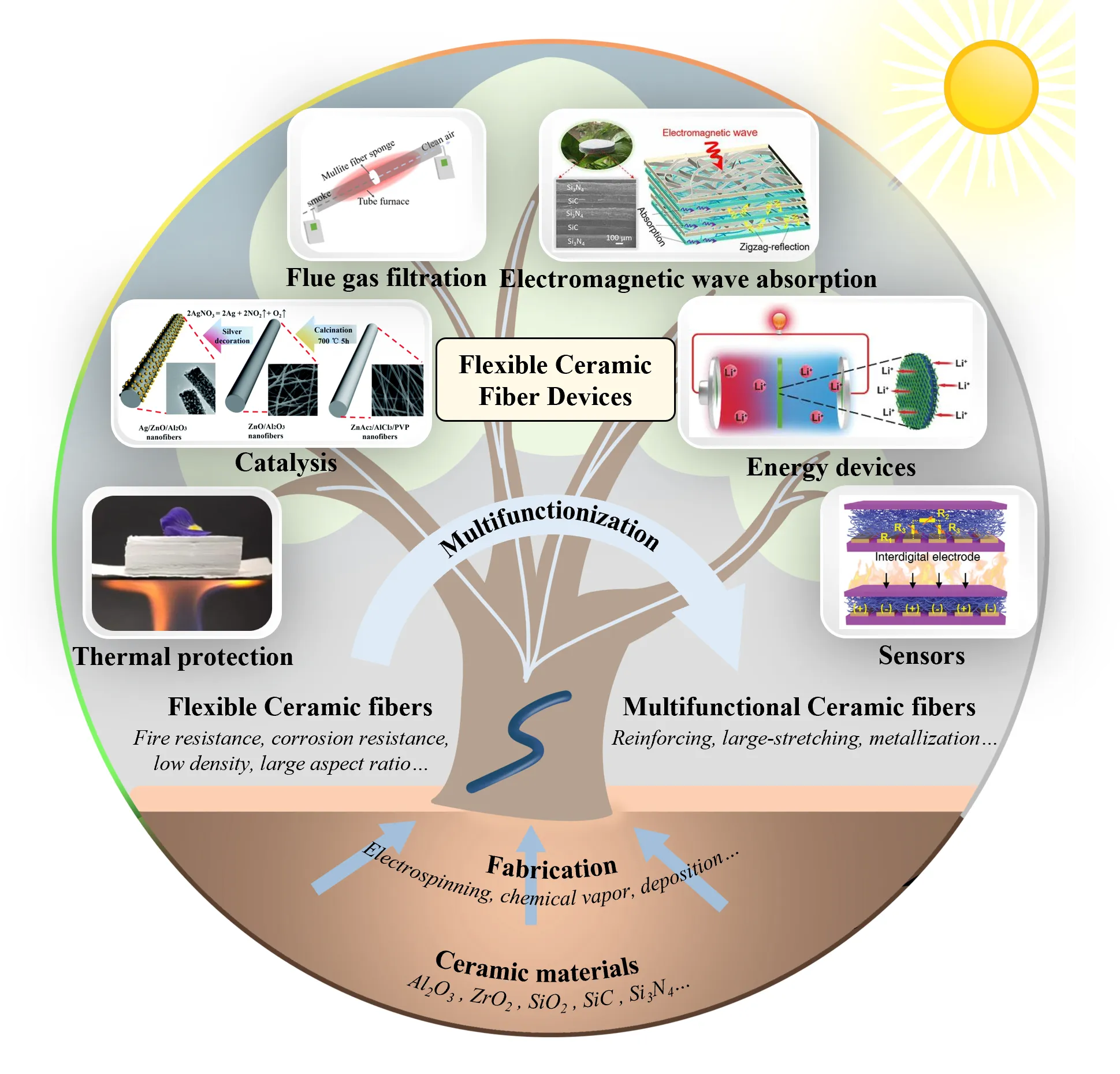 Flexible ceramic fibers (FCFs) have emerged as a highly promising material for high-temperature applications, effectively combining the excellent thermal stability of ceramic materials with the robust mechanical properties of flexible fibers. This review provides a comprehensive overview of recent advances in multifunctional FCF devices, focusing on innovative methods across material selection, structural design, and fabrication techniques to enhance their functional properties. These improvements, i.e., mechanical strength, thermal conductivity, and oxidation resistance, make FCFs particularly suitable for a wide range of applications, including energy storage, sensing, and high-temperature filtration. Notably, advancements in fabrication techniques have enabled the creation of novel FCF devices for thermal insulation and high-temperature sensing, such as stretchable ceramic membranes and printable ceramic fiber papers. The review concludes by discussing the future potential of FCFs, especially in multifunctional applications in high-temperature environments, where they can serve as essential components of advanced technologies. This work highlights the versatility and potential of FCFs as a transformative material for next-generation high-temperature applications.