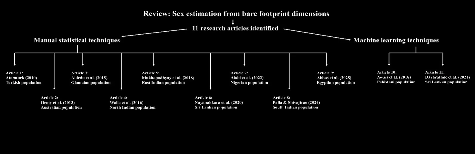 In forensic podiatry, bare footprints are considered an essential evidence element. The anthropometric and morphological study of the footprints takes into account both quantitative and qualitative features. Predictions of sexual dimorphism from bare footprints are deemed effective, pertaining to the fact that the overall body structure of humans influences the actual foot size. In the current review, 11 research articles have been identified that have exclusively focused on sex estimation from bare footprint dimensions across diverse demographic groups worldwide. The study found analytical techniques such as sectioning points, regression analysis, discriminant function analysis, and machine learning models have been used for sex estimation. The studies under review infer that different populations and best predictors have varying degrees of accuracy when compared to predicting sex from footprints. By pointing out that machine learning approaches are more accurate than traditional analytical methods, the study promotes their use in sex estimation from footprint dimensions for improving accuracy and analyzing large and complex datasets.
