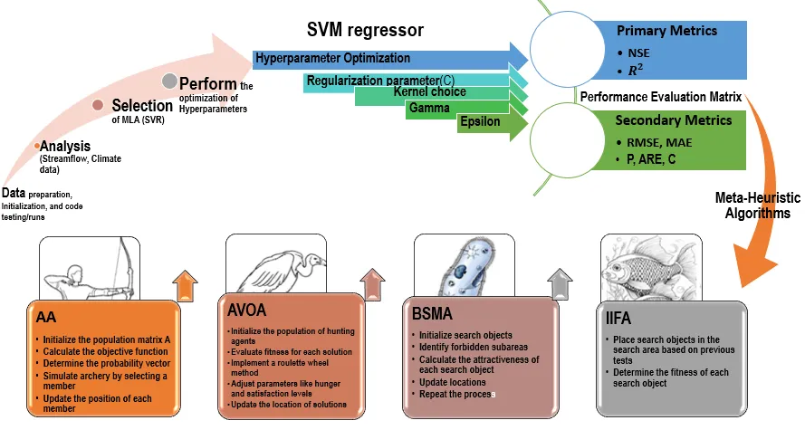 Accurate streamflow prediction is essential for irrigation planning, water allocation, and flood risk management, particularly in water-scarce regions like the Niger River Basin. However, the complexity of hydrological processes and data limitations make reliable predictions challenging. This study optimizes Support Vector Machine (SVM) hyperparameters for daily streamflow prediction using time-lagged climate data and four metaheuristic algorithms—Binary Slime Mould Algorithm (BSMA), African Vulture Optimisation Algorithm (AVOA), Archery Algorithm (AA), and Intelligent Ice Fishing Algorithm (IIFA). Model performance was assessed using eight evaluation metrics, with results showing that AA and IIFA consistently outperform the others, achieving Nash-Sutcliffe Efficiency (NSE) values between 0.986–0.999 and 0.893–0.999, respectively. AVOA and BSMA show less consistent performance, with NSE ranges of 0.524–0.999 and 0.863–0.965, respectively. The study highlights the novel integration of multiple metaheuristic algorithms for optimizing machine learning models, offering insights into their effectiveness for hydrological prediction. By demonstrating the superior performance of AA and IIFA, this research provides a robust framework for enhancing long-term streamflow forecasting. These findings support improved water resource management in West Africa, helping policymakers address climate variability, water scarcity, and hydrological uncertainty.