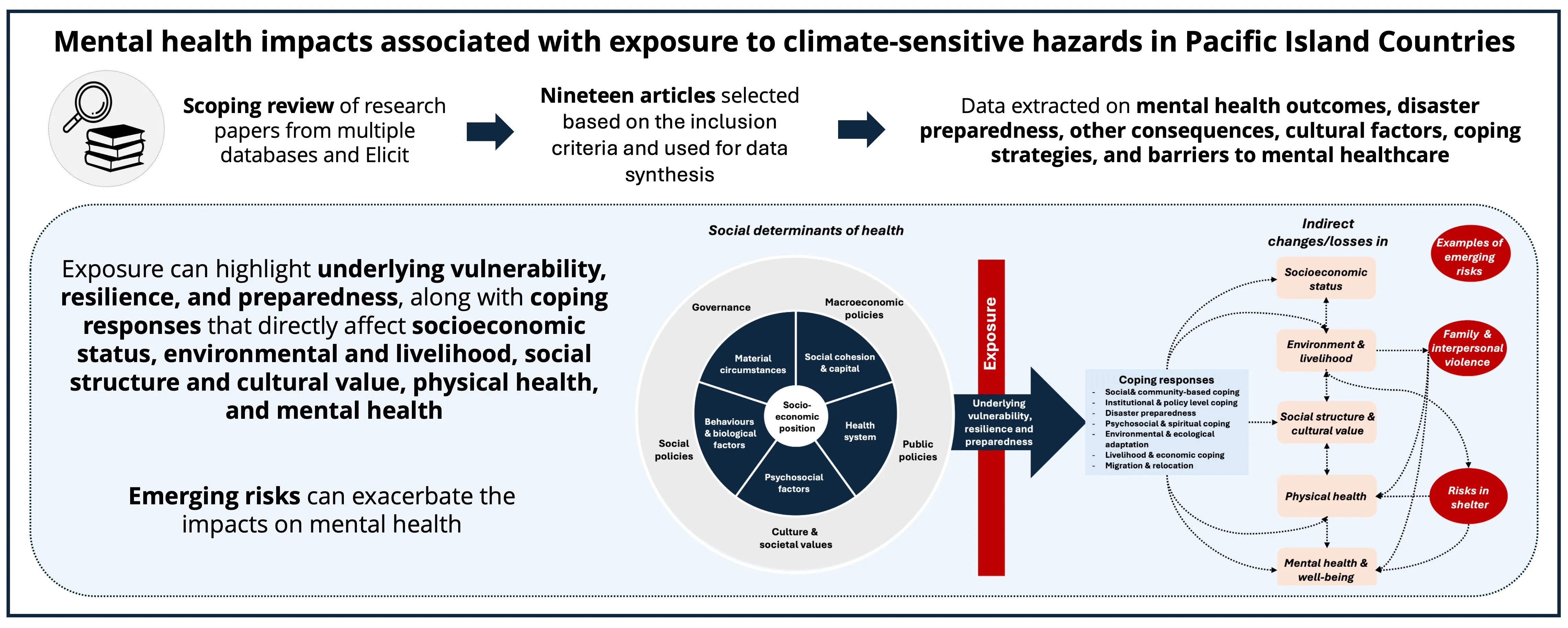 Pacific Island Countries (PICs) face some of the most severe health risks from climate change, with associated mental health impacts that remain under-recognized. This scoping review synthesizes peer-reviewed literature published by February 2025 to examine the mental health consequences of exposure to climate-related hazards across 22 PICs. The search identified 193 studies, 19 of which were included in the review. Most studies employed qualitative or mixed methods, focusing on storms, droughts, sea-level rise, planned relocation, and environmental changes. Reported mental health outcomes included increased depression, anxiety, grief, and distress, often linked to direct exposure and secondary effects such as displacement, resource insecurity, and social disruption. Risk and protective factors were identified, emphasizing broader social, cultural, spiritual, and environmental influences that mediate the relationships between climate-sensitive hazard exposures and mental health outcomes in PICs. Cultural mediators such as traditional knowledge, land connection, and community cohesion shaped both vulnerability and resilience. Common coping strategies included relocation, community-based support, and leadership-driven actions. However, access to mental healthcare remained limited due to a shortage of trained professionals, stigma, and preference for traditional healing methods. To address these challenges, it is essential to integrate mental health into national public health frameworks, enhance disaster preparedness, increase access to mental health services, and conduct context-specific research.