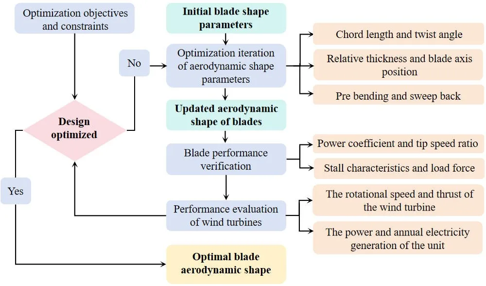 Optimizing aerodynamic performance with low loads is a core objective in high-power wind turbine blade design. This study develops a blade aerodynamic optimization design platform based on the performance of a wind turbine. By applying automated design principles, the platform rapidly iterates to obtain blade profiles that meet turbine development requirements, significantly improving design efficiency and reliability. Key findings include That Optimizing chord length and relative thickness distributions substantially contribute to enhancing power generation while reducing load levels. Relative thickness and twist angle distributions are critical parameters influencing stall characteristics during blade operation. Superior aerodynamic performance notably increases annual rated power generation hours but simultaneously elevates blade thrust and root loads. Among the evaluated designs meeting turbine specifications, the #436 blade achieves a maximum power coefficient of 0.4679 while maintaining low ultimate and fatigue loads. Furthermore, when paired with the wind turbine, its rated wind speed reaches 10.9 m/s, and its annual rated power generation hours under various inflow wind speed conditions all meet the turbine system’s development requirements. Consequently, the #436 blade demonstrates exceptional system compatibility, making the 8.5 MW turbine equipped with this blade highly competitive in the market.