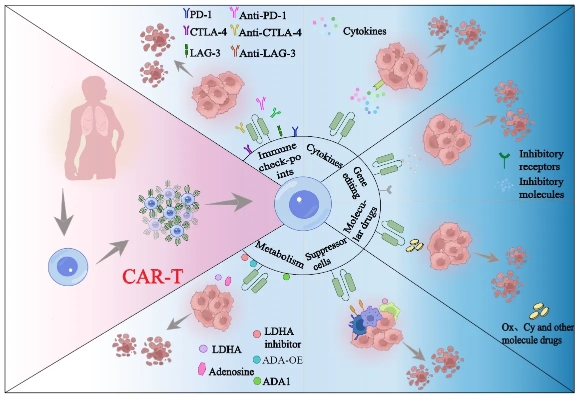 Chimeric Antigen Receptor T (CAR-T) cell therapy represents a groundbreaking advancement in cancer treatment, demonstrating remarkable antitumor efficacy in hematological malignancies. However, despite the substantial clinical progress achieved with CAR-T cell therapy, its application in the treatment of solid tumors remains limited by various factors, including the intricate tumor microenvironment (TME), CAR-T cell exhaustion, CAR-T cell infiltration into tumor tissue, and antigen heterogeneity. Scientists are relentlessly pursuing research in this domain, driven by the aim of offering newfound hope to cancer patients. In this comprehensive review, we delineate the fundamental principles underlying CAR-T cell therapy, delve into the challenges it encounters, and provide an insightful exploration of the advancements and progress made in the application of CAR-T cell therapy for solid tumors.