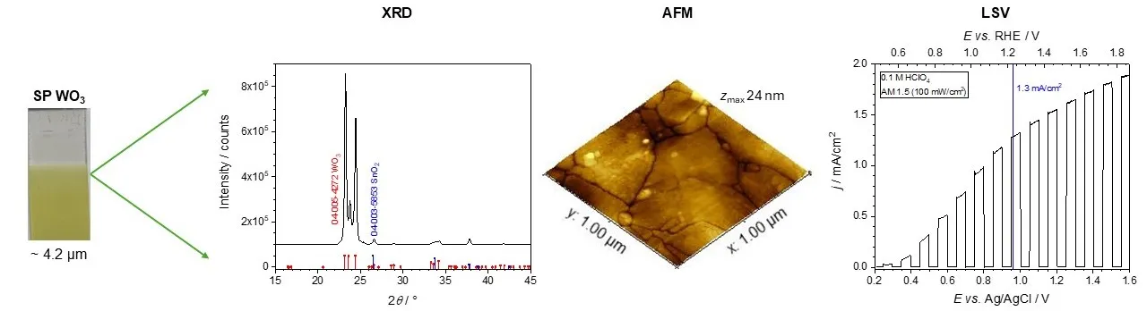 WO3 layers were prepared by spray pyrolysis of a peroxotungstic acid solution on FTO/glass substrates. Investigated parameters were layer thickness and influence of post-annealing in air. Films deposited at 250 °C were amorphous. Post-annealing at 550 °C for 2 h resulted in the formation of monoclinic crystalline structure. A comprehensive account of electrochemical efficiency in terms of IPCE for WO3 films as a function of the three parameters (wavelength, thickness and direction of light incidence) fully characterizing the photoelectrodes is presented here for the first time. The highest improvement in crystallinity and also the highest photocurrent response was found for WO3 layers deposited at 250 °C and post-annealed at 550 °C, namely 1.9 mA/cm2 (in 0.1 M HClO4 at 1.6 V vs. Ag/AgCl) under irradiation with a solar simulator (AM 1.5, 100 mW/cm2) and IPCE = 0.5 at 369 nm (front side irradiation), which is comparable with values obtained by other deposition techniques (e.g., hydrothermal or sol gel). Spray pyrolysis as a method of fabricating WO3 electrodes has the advantage of being able to produce large electrodes for use in practical applications.