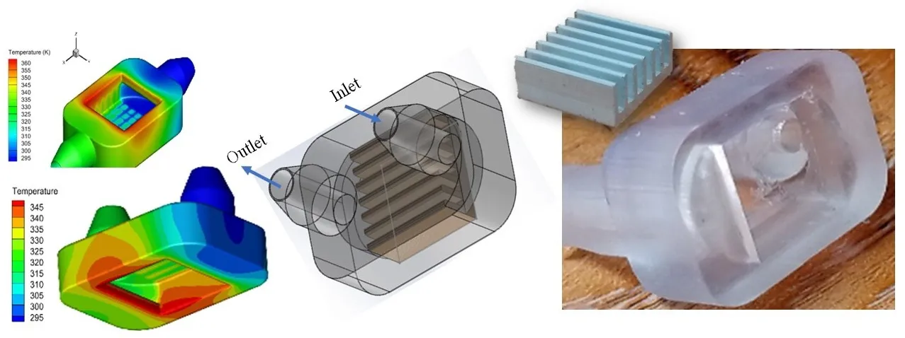 The present work aims to examine the influence of designing mini channel heat sinks using Stereolithography (SLA) 3D printing. Stereolithography (SLA) is a common additive manufacturing technique. The internal mini channels of the heat sink are made of aluminium materials and the outer cover is made of commercial polymer. Three models of the mini channel heat sinks are considered. A constant heat flow is applied to the bottom wall of the heat sink, and water is used as a coolant. The flow and heat transfer were studied for different cooling speeds. The physical properties of the fluid provided good thermal performance for the heat sink, especially at increased flow rates. The acrylonitrile butadiene styrene (ABS) copolymer resin has shown its good insulator for the heat sink and has improved the performance of the heat sink. This study demonstrates that the ABS copolymer resin enhances the cooling of electronic components.