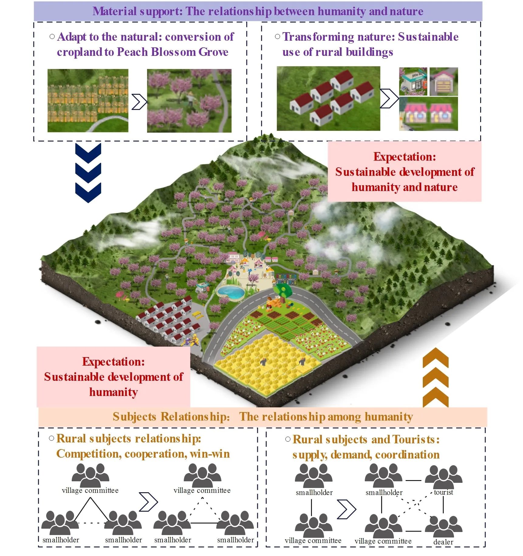 Sustainable development in mountainous and hilly regions is a critical component of global sustainability efforts. These regions are facing numerous challenges, including ecological fragility, labor migration, and resource scarcity and imbalance. Addressing these issues is imperative for sustainable development; this study identifies two primary conditions necessary for sustainable development in mountainous regions: achieving human and nature’s sustainable development, which provides reliable material support and social support for achieving the same in the mountainous and hilly regions. The flower-viewing economy, derived from transforming China’s mountain agriculture, is an efficient new format for mountainous and hilly regions. To verify these primary conditions, this study constructed a flower-viewing economy from three dimensions: material support, subject relationship, and expectation, using the peach blossom festival in Tingzi Village, Taihe Town of Chongqing City, as an example. Here, we explained that a sustainable development model focused on benefiting farmers is an endogenous, farmer-centered pathway to sustainable development, highly relevant to promoting sustainable development in developing countries’ mountain villages.