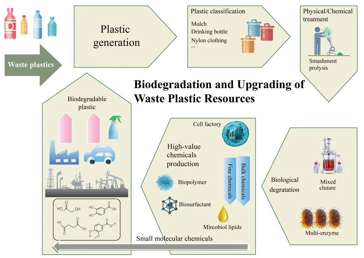 The high molecular weight, hydrophobicity, and strong chemical bonds of petroleum-based synthetic plastics make them highly resistant to both abiotic and microbial degradation. This resistance plays a significant role in the growing problem of “white pollution” where the accumulation of plastic waste has become a major environmental issue worldwide. Currently, plastic waste management relies largely on landfill disposal and incineration, with only about 20% of plastic waste being recycled. However, both methods create secondary environmental risks, such as contamination of groundwater, soil, air, and oceans. Therefore, developing a sustainable and efficient approach for recycling and reusing plastic waste is essential for tackling plastic pollution and promoting a circular plastic economy. One promising solution involves utilizing microorganisms and enzymes to break down plastics into oligomers or monomers, which can then be transformed into valuable chemicals. This method provides a more environmentally friendly and milder alternative to conventional waste management techniques. This review explores recent progress in biodepolymerization and biotransformation processes for plastic waste, including the identification of plastic-degrading microorganisms and enzymes, the creation of microbial consortia and enzyme mixtures, an investigation into the mechanisms of plastic depolymerization, and the conversion of degradation products into useful materials such as chemicals, energy, and other resources. Despite these advancements, several challenges remain, such as the limited availability of effective degradation enzymes, low degradation efficiency, and difficulties in utilizing the breakdown products. However, emerging technologies in synthetic biology, such as high-throughput screening, evolutionary metabolic engineering, and bioinformatics to study catalytic mechanisms of degradation enzymes, offer promising solutions to address these issues. By improving enzyme design, optimizing microbial consortia interactions, and developing efficient metabolic pathways for plastic degradation products, these innovations could greatly enhance plastic biodegradation. These advancements hold the potential to provide environmentally sustainable, economically feasible, and technically viable solutions for promoting a circular plastic economy, particularly in countries like China.