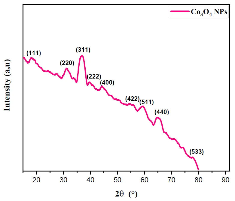 In this work, Cobalt oxide nanoparticles (Co3O4·NPs) were synthesized via a simple sonochemical reaction by using polyethylene glycol (PEG) as a surfactant. Structural, morphological and spectroscopic analysis of obtained powder (Co3O4·NPs) was investigated by X-ray diffraction, FTIR spectroscopy and scanning electron microscope (SEM). The nanocrystalline nature of the sample was confirmed by XRD, which exhibits the cubic face-centered normal spinel structure of (Co3O4·NPs) and the space group of Fd-3m with the average crystallite size around 15 nm. FTIR spectrum shows two strong absorption bands of (Co+2–O) and (Co+3–O) which confirm the spinel structure of Co3O4·NPs. Moreover, SEM micrographs showed that the agglomeration of the nanoparticles was reduced by the addition of (PEG) surfactant and UV-Vis was used to study the synthesized material’s optical properties. The Co3O4 band gap ranged around 2.2 and 3.5 eV.