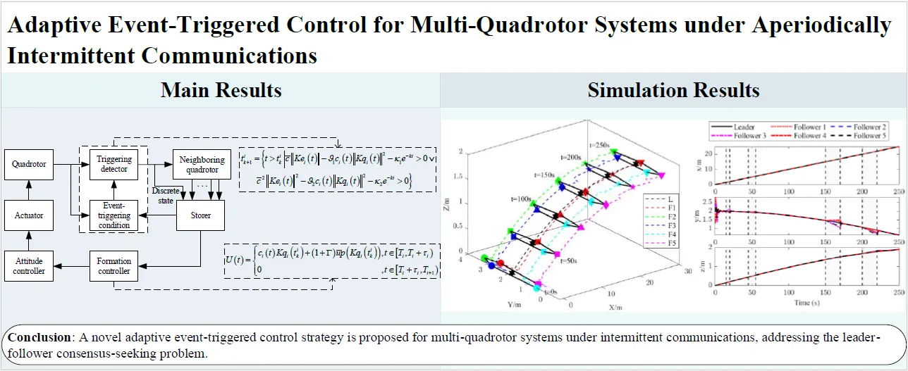 A novel adaptive event-triggered control strategy is proposed for multi-quadrotor systems under intermittent communications, addressing the leader-follower consensus-seeking problem where the leader has an unknown bounded input. Firstly, an activation time ratio condition is proposed, eliminating the reliance on the maximum time interval of intermittent communication. Secondly, a compensation term related to the leader’s unknown bounded input is designed in the controller to compensate for the error caused by intermittent communication in each period. Meanwhile, a prediction method is developed to eliminate the dependence on continuous information of neighboring quadrotors. Zeno behavior is strictly excluded, and communication among quadrotors is efficiently reduced with the designed event-triggering condition. Finally, numerical simulations verify the effectiveness and superiority of the proposed control strategy.