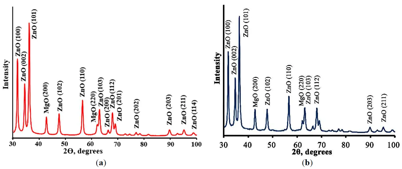 Porous Cu(Mn):ZnO-MgO composites synthesized by polymeric sol-gel method were characterized. The crystal structure, morphology, spectral properties, the ability of the photogeneration of chemically active singlet oxygen under external visible irradiation, photocatalytic and antibacterial properties of porous composites were studied. Obtained composites consist of small ZnO and MgO crystals having size less than 20 nm. It was found that Cu2+ and Mn2+ ions are embedded into the lattices of ZnO and MgO crystals, altering their crystal cell parameters. The band gap values of obtained composites are 3.41 ÷ 3.42 eV which are slightly higher than the band gap of pure ZnO. Prepared materials demonstrate a high ability of photogeneration of chemically active singlet oxygen under blue light (λ = 405 nm) irradiation. It was found that dependencies of the intensity of singlet oxygen photogeneration from the power density of visible irradiation are linear. Photocatalytic decomposition of the diazo dye Chicago Sky Blue in solutions under UV and blue light irradiation proceeds rapidly in the presence of the prepared composites (constants rate of photocatalytic dye decomposition under UV irradiation are 0.024 min−1 and 0.025 min−1 for ZnO-MgO composites doped with Cu and Mn, correspondingly). Porous composites demonstrate superior antibacterial activity against gram-positive bacteria. These materials are promising for practical application in medicine and photocatalytic technologies of air and water cleaning.