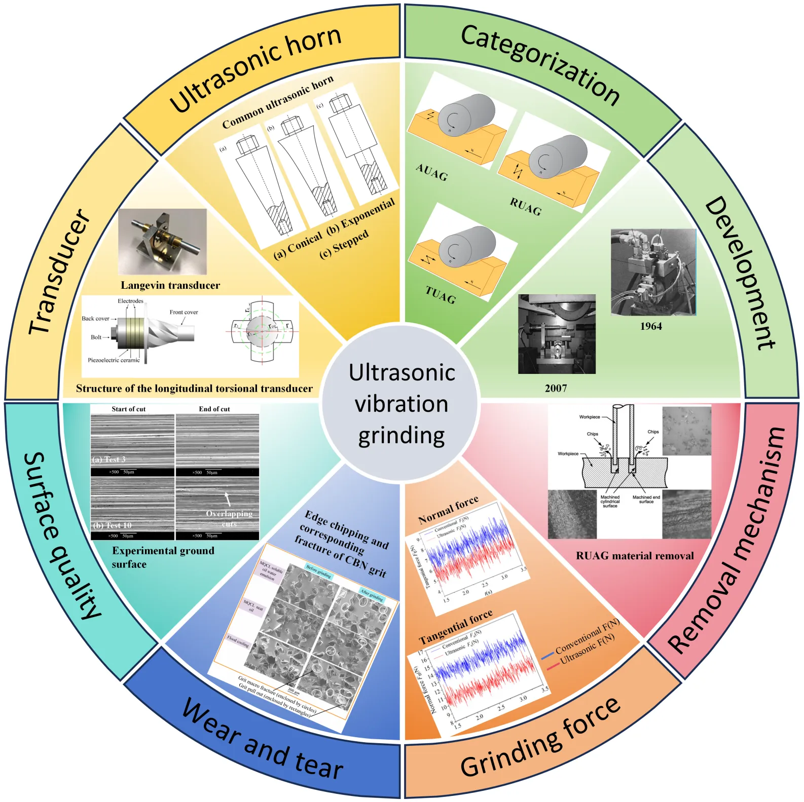 Ultrasonic vibration-assisted grinding (UVAG), which superimposes high-frequency, micro-amplitude ultrasonic vibration onto conventional grinding (CG), offers several advantages, including a high material removal rate, low grinding force, low surface roughness, and minimal damage. It also addresses issues such as abrasive tool clogging, thereby enhancing machining efficiency, reducing tool wear, and improving the surface quality of the workpiece. In recent years, the rapid development of advanced materials and improvements in UVAG systems have accelerated the progress of UVAG technology. However, UVAG still faces several challenges in practical applications. For example, the design and optimization of the ultrasonic vibration system to achieve high-precision, large-amplitude, and high-efficiency grinding remain key issues. Additionally, further theoretical and experimental studies are needed to better understand the material removal mechanism, the dynamics of grinding force, abrasive tool wear, and their effects on surface quality. This paper outlines the advantages of UVAG in machining advanced materials, reviews recent progress in UVAG research, and analyzes the current state of ultrasonic vibration systems and ultrasonic grinding characteristics. Finally, it summarizes the limitations of current research and suggests directions for future studies. As an emerging machining technology, UVAG faces challenges in many areas. In-depth exploration of the theoretical and experimental aspects of high-precision, large-amplitude, and high-efficiency ultrasonic vibration systems and UVAG is essential for advancing the development of this technology.