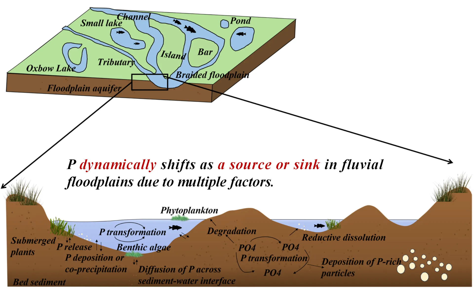 Fluvial floodplains are water-land transitional zones, playing an important role in hydrological and ecological systems. To date, the phosphorus migration and transformation in floodplain sediments remain elusive, which poses a large effect on river nutrient levels and primary productivity. This review summarized the sedimentary characteristics of floodplains and analyzed the spatial differences and temporal variations in phosphorus distribution. We further analyzed their potential change in floodplains under various conditions, determining the sedimentation and mineralization process of phosphorus. Meanwhile, phosphorus in the sediment will experience dynamic fluctuation as a source or sink of fluvial floodplains based on varying factors, including hydrological conditions, climate variations, biological activity, and pedological characteristics. In particular, the productivity and community population in floodplains, like vegetation and fishes, will be primarily associated with the periodic changes in phosphorus through food chain. Lastly, this review provided corresponding perspectives on improving the phosphorus administration in river floodplains based on existing problems. In total, it is anticipated that it will enhance the understanding of phosphorus resources or sink in the fluvial floodplains, contributing to the stability of aquatic ecosystems.