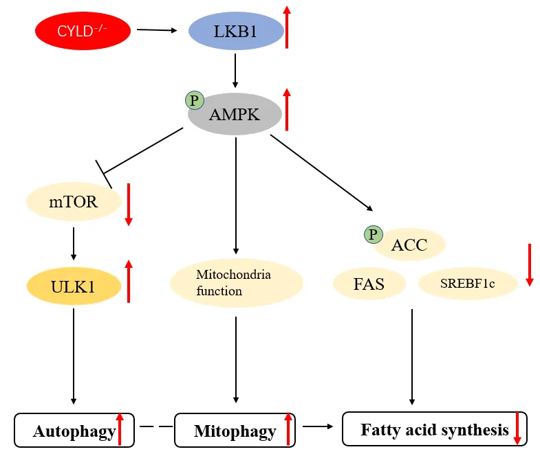 The deubiquitinating enzyme cylindromatosis (CYLD) plays a fundamental role in regulating T cell development and activation. Previous studies have shown that CYLD is associated with autophagy, while AMP activated protein kinase (AMPK) pathway regulates the development of autophagy and affects cell metabolism. However, the mechanism by which CYLD affects autophagy and whether it affects the downstream metabolism of AMPKα remains unclear. In this study, we used the CYLD gene knockout model in Jurkat cells to investigate the mechanism of CYLD and autophagy and its relationship with cellular metabolism. The results show that CYLD deletion promotes autophagy through AMPKα/mTOR/ULK1 signaling pathway, promotes mitochondrial autophagy to improve mitochondrial function and attenuates cell lipid metabolism in Jurkat cells.