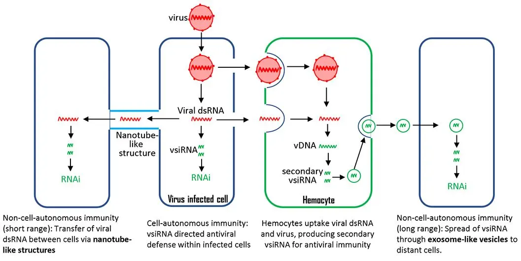 In Drosophila melanogaster, the siRNA-directed RNAi pathway provides crucial antiviral defenses. Cell-autonomously, Dicer-2 (Dcr-2) recognizes and cleaves viral dsRNA into siRNAs, which are incorporated into the RNA-induced silencing complex (RISC). Argonaute 2 (Ago2) then targets and cleaves viral RNA, preventing replication. Non-cell-autonomously, infected hemocytes secrete exosomes containing viral siRNAs, spreading antiviral signals to other cells. Additionally, tunneling nanotubes can transfer RNAi components between neighboring cells, further enhancing systemic immunity. These findings highlight the sophisticated antiviral strategies in Drosophila, offering insights for broader antiviral research.