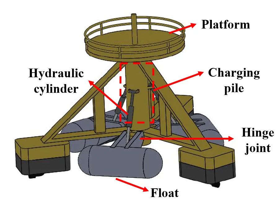 This paper proposes a novel three-dimensional oscillating pendulum wave energy converter (WEC) that integrates an oscillating float dock station. The device captures wave energy by utilizing both the pitch and roll motions of its primary float and the pendular motion of a buoy. A time-domain analysis method is used to numerically evaluate the hydrodynamic behavior and energy conversion efficiency of the WEC. In ANSYS AQWA, a multi-cantilever WEC model is employed to address the fluid-solid coupling, calculating the device’s motion response and capturing the width ratio under various environmental conditions. Additionally, by modifying key geometric parameters including float radius, length, and cantilever angle, the study examines the rotation at the articulation point and the capture width ratio variation for different device configurations. Results indicate that the device achieves a maximum capture width ratio at a float radius of approximately 120 mm under T = 1.4 s, and a 130 mm for wave periods of 1.5 s and 1.6 s. The highest average capture width ratio is reached at a power take-off (PTO) damping coefficient of 400 N·s/m. The study further investigates the effect of cantilever angle and float length, aiding in the optimization of these geometric parameters.