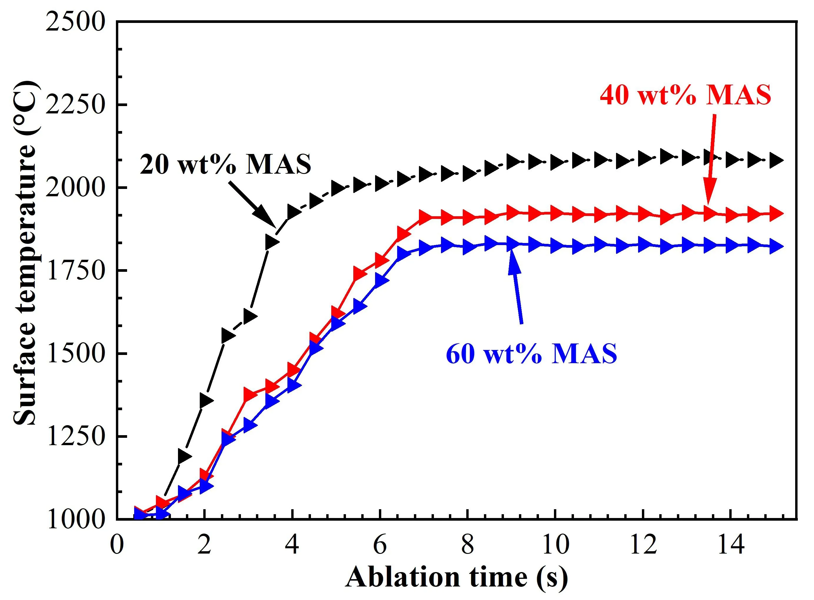 Ablation resistance is a critical factor in evaluating the performance of BN-based ceramic composites under extreme service conditions. This study investigates the ablation behavior and underlying mechanisms of BN-MAS wave-transparent ceramic composites with varying magnesium aluminum silicate (MAS) content through oxyacetylene torch tests. The results reveal that increasing the MAS content reduces the mass ablation rate from 0.0298 g/s to 0.0176 g/s and the linear ablation rate from 0.149 mm/s to 0.112 mm/s. The incorporation of MAS into h-BN ceramics significantly lowers the surface ablation temperature, primarily due to the evaporation of B2O3 (g) and MAS ceramics. Cross-sectional analysis of the ablated composites indicates the presence of micro- and macro-spallation in the ablation center. The primary ablation products are magnesium-aluminum borosilicate glass and mullite. Key ablation mechanisms include the oxidation of h-BN under flame exposure, the erosion of viscous oxidation products, and the physical degradation of the matrix caused by the high-velocity gas flow.