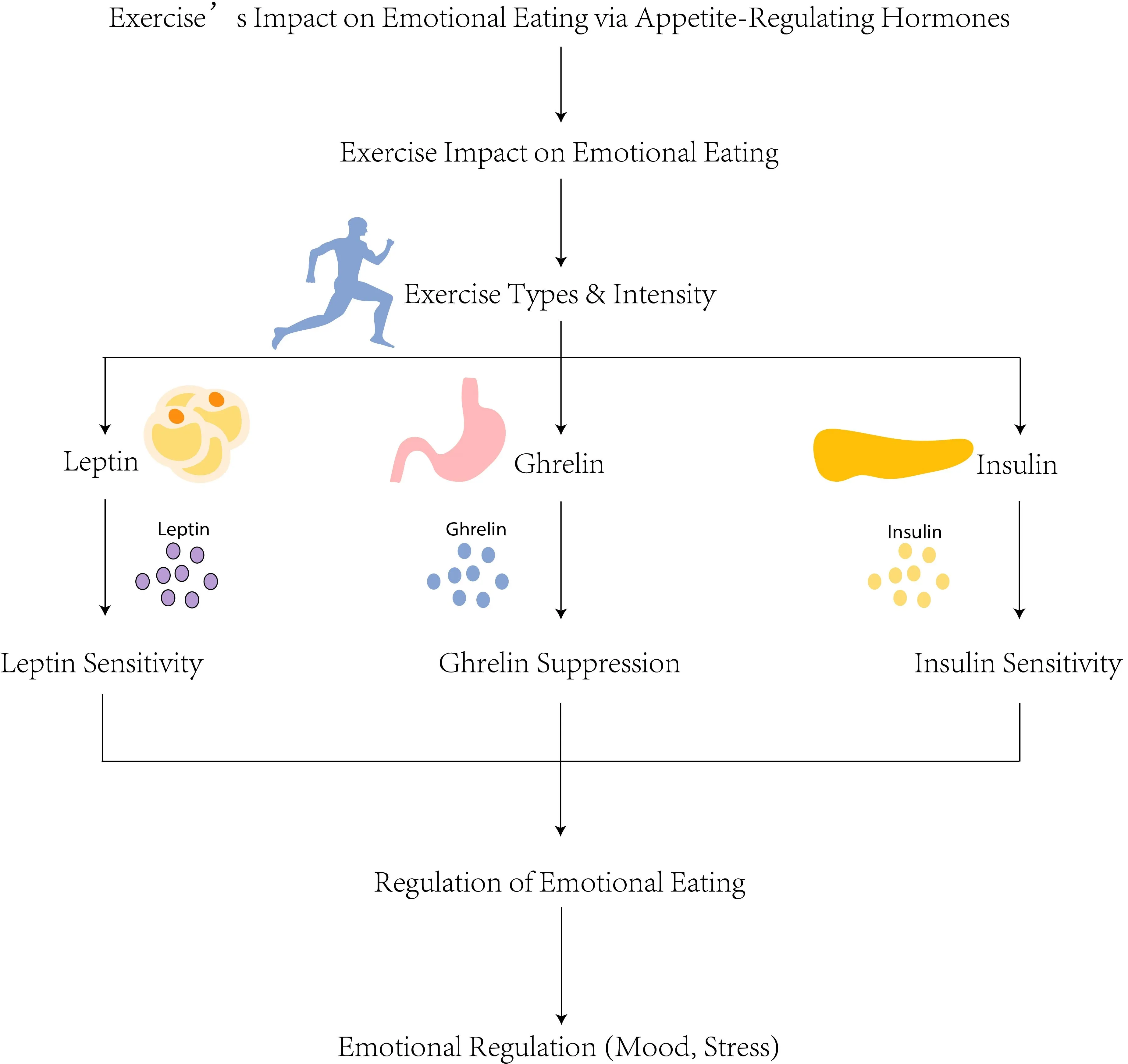 Emotional eating denotes the behavior in which individuals regulate their emotions by eating in response to adverse emotions or psychological stress. Emotional eating is tightly linked to health issues such as obesity and metabolic disorders, and may give rise to unhealthy eating habits. The aim of this review is to investigate the psychological and physiological mechanisms of emotional eating, probe the potential impact of exercise as a tool for emotional regulation in emotional eating, and its role in avoiding the development of emotional eating into binge eating disorder. In addition, the review assesses gender differences and the potential risks of exercise interventions, aiming to provide theoretical support for clinical applications. A literature search was performed to assess the literature relevant to the role of appetite-controlling hormones and exercise in emotional eating. The search process covered multiple databases, including PubMed, Web of Science, Scopus, and Google Scholar. It used a combination of keywords such as “emotional eating”, “appetite-controlling hormones”, “exercise”, and “mood regulation” to ensure comprehensive coverage of relevant areas. Inclusion criteria were original research, review articles, and meta-analyses published in English with adult participants. Exclusion criteria included studies relevant to non-emotional appetite changes due to diseases, studies without exercise interventions, and those missing physiological data. The final selected literature was reviewed and considered by independent reviewers to ensure the quality and relevance of the research. Studies suggest that emotional eating is tightly relevant to dysfunction in emotional regulation mechanisms. Specifically, when encountering adverse emotions, individuals may choose high-calorie foods to seek emotional comfort. Exercise, as an effective method of emotional regulation, can reduce emotional eating by modulating appetite hormones (such as leptin and ghrelin) and enhancing emotional well-being. However, the effects of exercise differ by gender, with women generally more likely than men to regulate emotions and lower appetite through exercise. Despite the positive regulatory effects of exercise, intense exercise may also give rise to adverse psychological and physiological effects, such as anxiety, depression, and overtraining syndrome. Hence, exercise interventions should be modified according to individual conditions to avoid excessive risks. Emotional eating overlaps with a binge eating disorder, and if emotional eating is not efficiently managed, it may progress to a binge eating disorder. Thus, exercise interventions could act as an effective means of preventing emotional eating from evolving into a binge eating disorder. In summary, this review emphasizes the importance of emotional regulation in modulating emotional eating, and the positive role of exercise interventions in emotional eating, notably in avoiding binge eating disorder. Future research should further probe the optimal exercise intervention strategies and focus on gender differences and the potential risks of exercise interventions.
