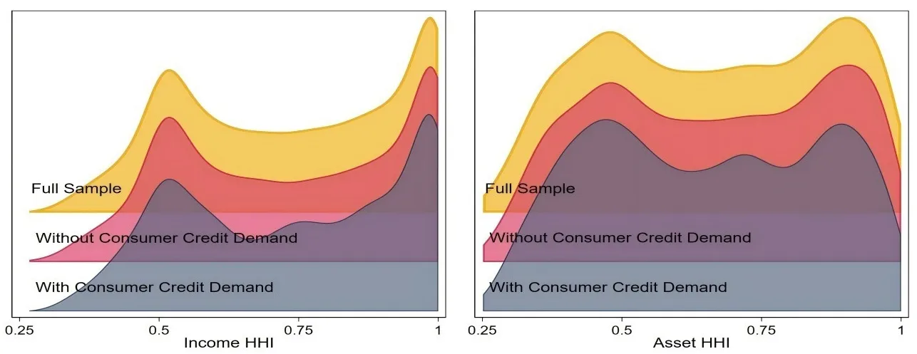 China’s ongoing supply-side structural reforms and the government’s strategic focus on rural revitalization catalyze a significant transformation in rural landscapes. The steady rise in rural residents’ incomes and assets, along with gradual improvements in household quality of life, is unlocking significant potential for growth and upgrades in the rural consumer market.This evolution necessitates a more diversified and sophisticated approach to financial services that is more inclusive and widespread. Despite the challenges, such as an aging population and imperfect credit systems that have limited the quality and precision of rural financial services, the analysis of household income and asset structures is vital for understanding consumption patterns and enhancing the economic vitality of rural households. Our study, based on the 2019 China Household Finance Survey data of 11,386 households and employing the Heckman two-stage model, finds that the proportions of income components and financial assets, moving in opposite directions, significantly influence the amount of consumer credit demanded, while other asset types, such as real estate, show no significant effect. The examination of income and asset diversity through the Herfindahl-Hirschman Index (HHI) demonstrates varying impacts of income and asset structures on credit demand, depending on the concentration levels of income and assets. Additionally, our analysis of heterogeneity based on the age of the household head and geographic region highlights the diverse influences on the amount of consumer credit demand, underscoring the importance of tailoring financial products and policies to meet the specific needs of rural households. These findings shed light on these dynamics and inform financial service innovations that align with the needs of rural consumers, thereby supporting the broader objectives of rural economic development and the achievement of China’s rural revitalization strategies.