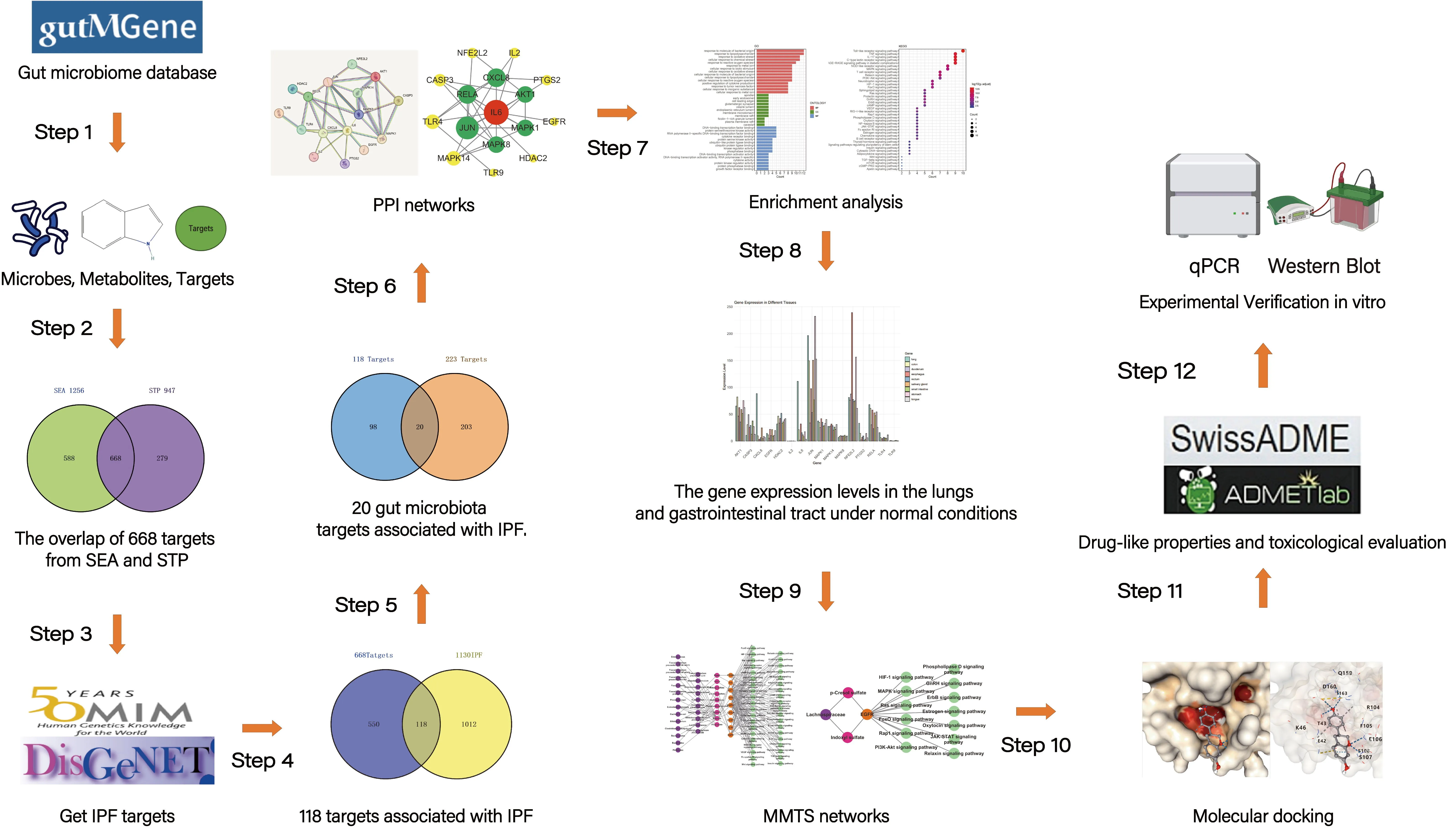 Idiopathic pulmonary fibrosis (IPF) is a chronic, progressive fibrotic lung disease with a poor prognosis. Previous research has revealed that the gut microbiota is associated with human health and immunity, and it interacts with the lung through the “gut-lung axis”. This study explores the potential relationship between Gut Microbiome Metabolites and Idiopathic pulmonary fibrosis via Network Pharmacology Study. The metabolites from gut microbiota were retrieved from the gutMGene database, and gene targets for these metabolites were obtained from previous studies. Gene targets of IPF were obtained from public databases (DisGeNET, OMIM). Subsequently, following the identification of shared targets, IL6 was determined as the core target through protein-protein interaction analysis. Then, a microbiota-metabolite-target-signaling pathway network (MMTS) was constructed using Cytoscape 3.10, and targets with low expression in the lungs and intestines were deleted. The MMTS network revealed that three short-chain fatty acids—acetate, butyrate, propionate, and a flavonoid compound called equol—are IL6-related metabolites. Then, we performed a molecular docking test (MDT) using CB-Dock2 to validate the affinity between core targets and metabolites. MDT confirmed that equol produced by the conversion of isoflavones from Lactobacillus paracasei JS1 was more stable in binding to IL6 than the other three short-chain fatty acids, thereby affecting multiple signaling pathways and influencing the progression of IPF. Finally, we validated this hypothesis through in vitro cell culture experiments, further confirming the effect of Equol.