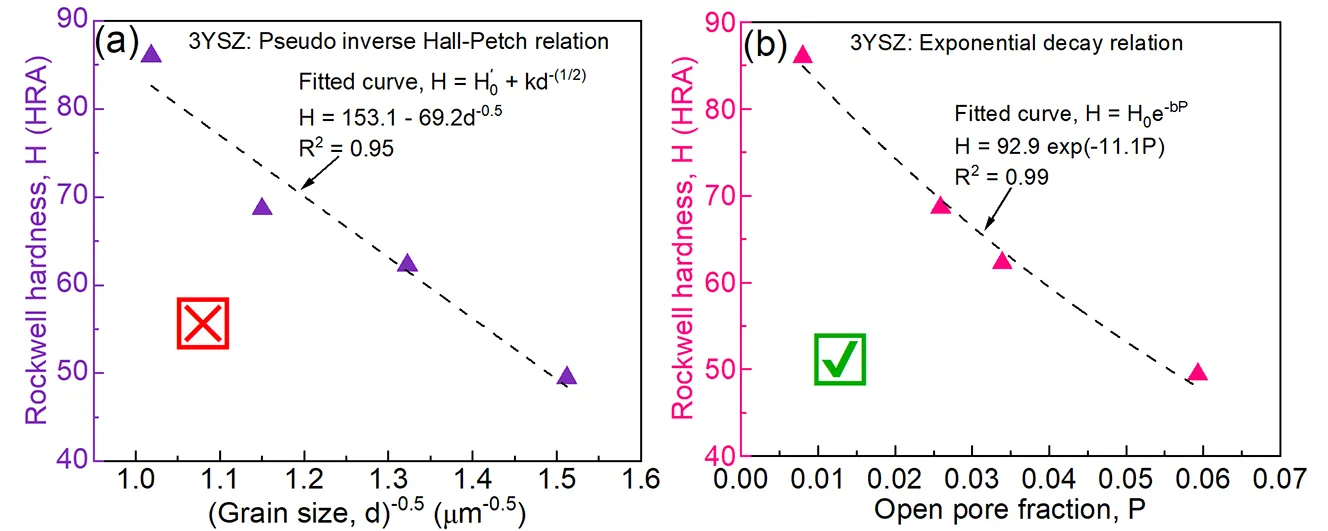 Considerable research has been done in the past on expensive, <50 nm particle size 3 mol% yttria-stabilized zirconia (3YSZ) using advanced sintering techniques. However, insights are still needed to reveal which factors among grain size and porosity, when both are changing simultaneously, more strongly control the hardness of conventionally sintered, relatively coarse, 250 nm 3YSZ powder, which can be used to make large industrial engineering ceramic parts at a lower cost. This investigation showed that elevating the sintering temperature from 1500 °C to 1650 °C increased the Rockwell hardness from 49.4 HRA to 86.0 HRA, which was concomitant with an increase in grain size and bulk density. A pseudo-inverse Hall-Petch relationship between hardness and grain size was observed given by H (in HRA) = 153.1 − 69.2/$$\small\sqrt{(\mathrm{grain}\,\mathrm{size})}$$ with a somewhat low R2 of 0.95, which was mainly due to the porosity being an additional important variable. Compared to grain size, the impact of open pore fraction (P) on hardness was stronger, inferred from a higher R2 of 0.99 while fitting the data into the well-known exponential decay equation, H = 92.9 exp(−11.1P). Finally, it was observed that the 3YSZ conventionally sintered at 1650 °C for 2 h had 0.8% open porosity, 6.08 g/cm3 bulk density, 960 nm grain size and consisted of only tetragonal ZrO2.