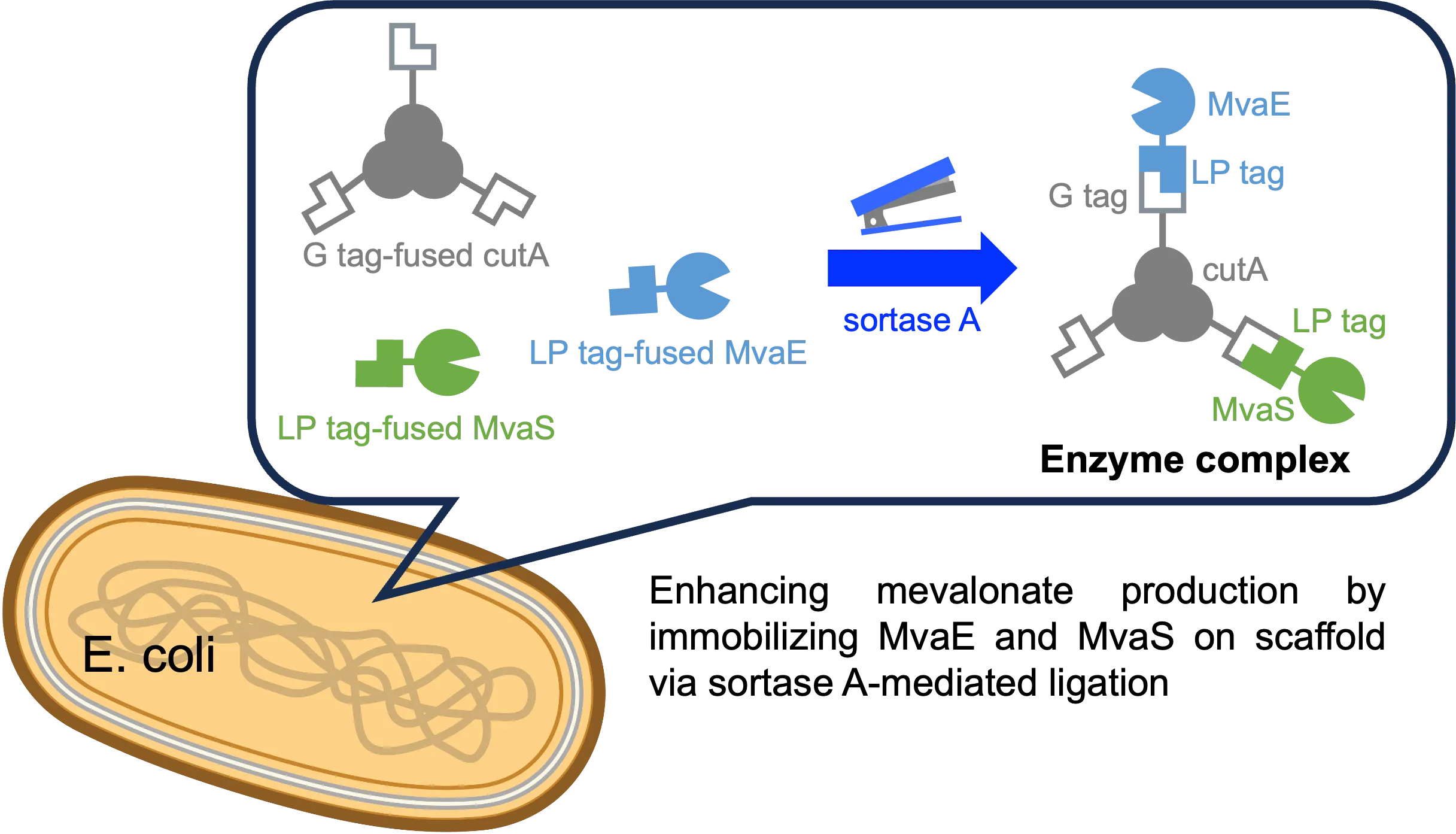 Microorganisms have been extensively studied for their production of valuable chemicals. However, conventional gene fusion approaches often lack versatility and can result in enzyme inactivation. This study explored an alternative strategy for inducing metabolic channeling through sortase A-mediated ligation of metabolic enzymes. Sortase A recognizes specific amino acid sequences and selectively conjugates proteins at these sites. We focused on mevalonate production as a proof-of-concept to enhance the yield by assembling metabolic enzymes on a protein scaffold using sortase A. Although metabolic enzyme complexes were successfully formed using streptavidin as a scaffold, production did not improve. The use of CutA as a scaffold led to a 1.32-fold increase in production compared with that of the strain without the scaffold, demonstrating the efficacy of CutA in mevalonate production. These findings suggest that using sortase A to assemble metabolic enzymes onto a scaffold can effectively enhance microbial bioproduction.