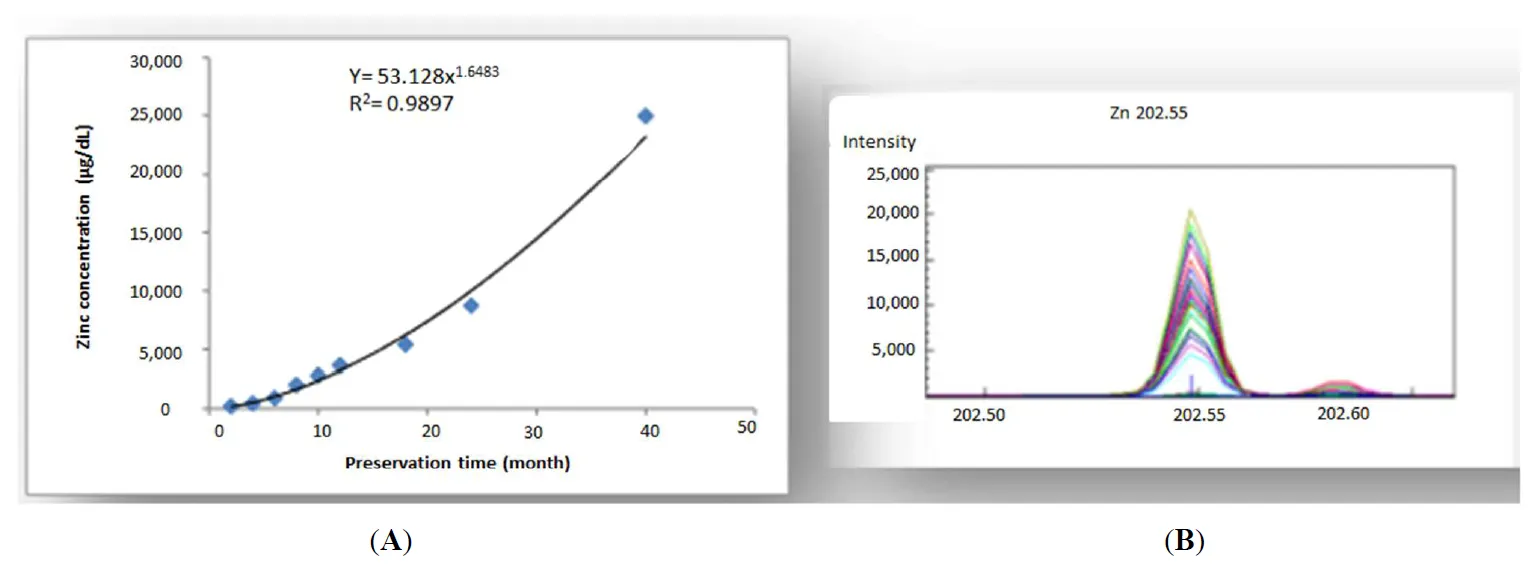 Postmortem testing for metals is crucial in forensic toxicology to determine whether metal exposure contributed to an individual’s death. However, current reference ranges for metal concentrations, primarily based on living individuals, fail to account for postmortem physiological changes. This study addresses this gap by analyzing thelevels of zinc and iron postmortem blood levels over various postmortem intervals (PMI) using Inductively Coupled Plasma Optical Emission Spectroscopy (ICP-OES). Fifty samples were analyzed, revealing a significant increase in metal concentrations over time, with zinc levels rising from 181 μg/dL to 24,935 μg/dL and iron levels from 155 μg/dL to 11,421 μg/dL across a 40-month PMI. These changes are attributed to the redistribution of metals from tissues into the bloodstream and decomposition processes. The study proposes postmortem-specific reference ranges, emphasizing the need for forensic pathologists and toxicologists to consider PMI in their assessments to avoid misinterpretation and inaccurate cause-of-death determinations. This research underscores the necessity of updating reference ranges for postmortem analysis, ultimately improving the accuracy of forensic toxicology reports and contributing to more reliable determinations of cause of death.