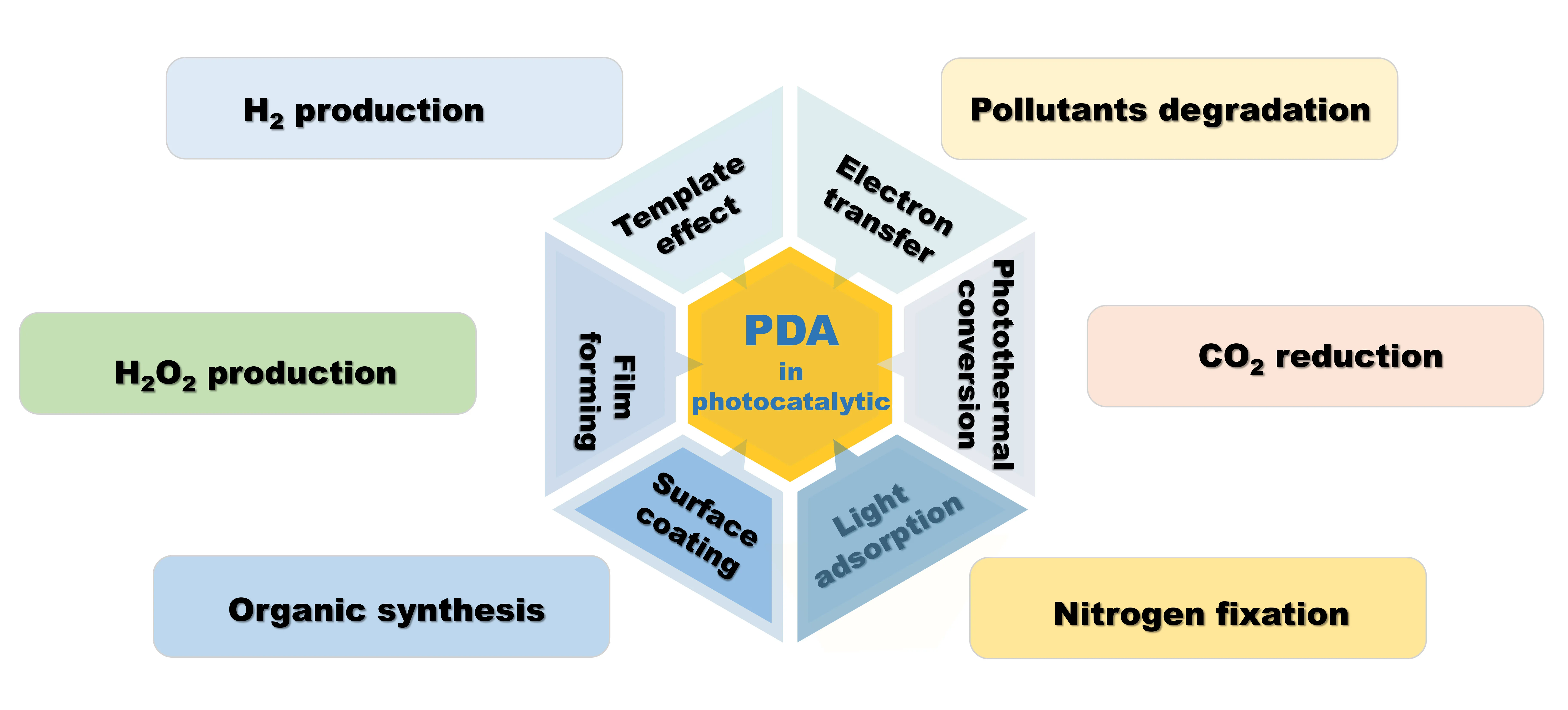 Polydopamine (PDA) is also widely sought after in photocatalytic applications due to its fascinating properties such as simple preparation, templating agent, near-infrared absorption, high photothermal conversion efficiency, abundant functional groups, and strong chelating effect of metal ions. This review will present the structural features and synthetic methods of PDA, the advantages of PDA for photocatalytic applications (templating agent effect, light absorption properties, film-forming properties, hydrophilicity, conductivity, etc.), the modulation strategies of PDA for photocatalytic applications, and the use of PDA-based photocatalytic materials for solar-powered water purification (heavy metal adsorption and reduction, catalytic degradation of organic pollutants, and antimicrobial properties), hydrogen production, hydrogen peroxide production, CO2 reduction, and organic conversion. Finally, this review will provide valuable information for the design and development of PDA-based photocatalytic materials.