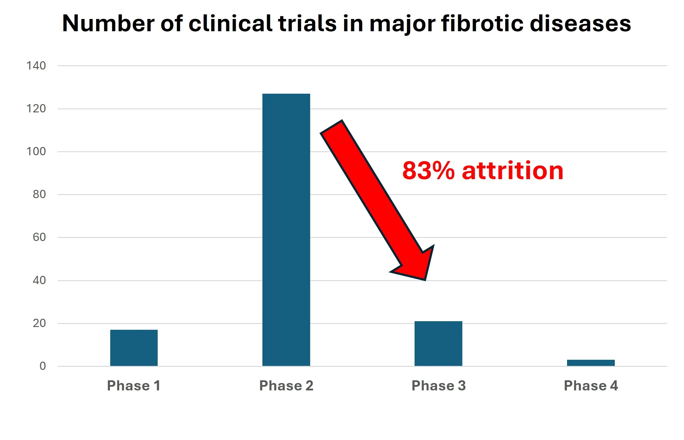 Fibrosis is defined as the excessive accumulation and disorganized deposition of extracellular matrix components, affecting any organ in the human body. Fibrotic diseases of the vital organs such as lung, heart, kidney and liver can be chronic, progressive, irreversible and fatal. Although fibrotic diseases account for 45% of the mortality in the Western world, the available treatment options are limited in numbers, efficacy and safety. There is certainly a lack of progress in developing novel anti-fibrotics even though the market size for fibrotic diseases is estimated to be ~$30B and several pharmaceutical companies have active R&D programmes in this field. We reviewed the current efforts in developing novel anti-fibrotic medicines focusing on lung, heart, kidney, liver and skin fibrosis. Our analysis revealed an estimated 83% attrition rate from Phase 2 to Phase 3 trials across the five fibrotic diseases. The possible reasons for the slow pace and high attrition rates in developing new anti-fibrotics are discussed and potential solutions are proposed.