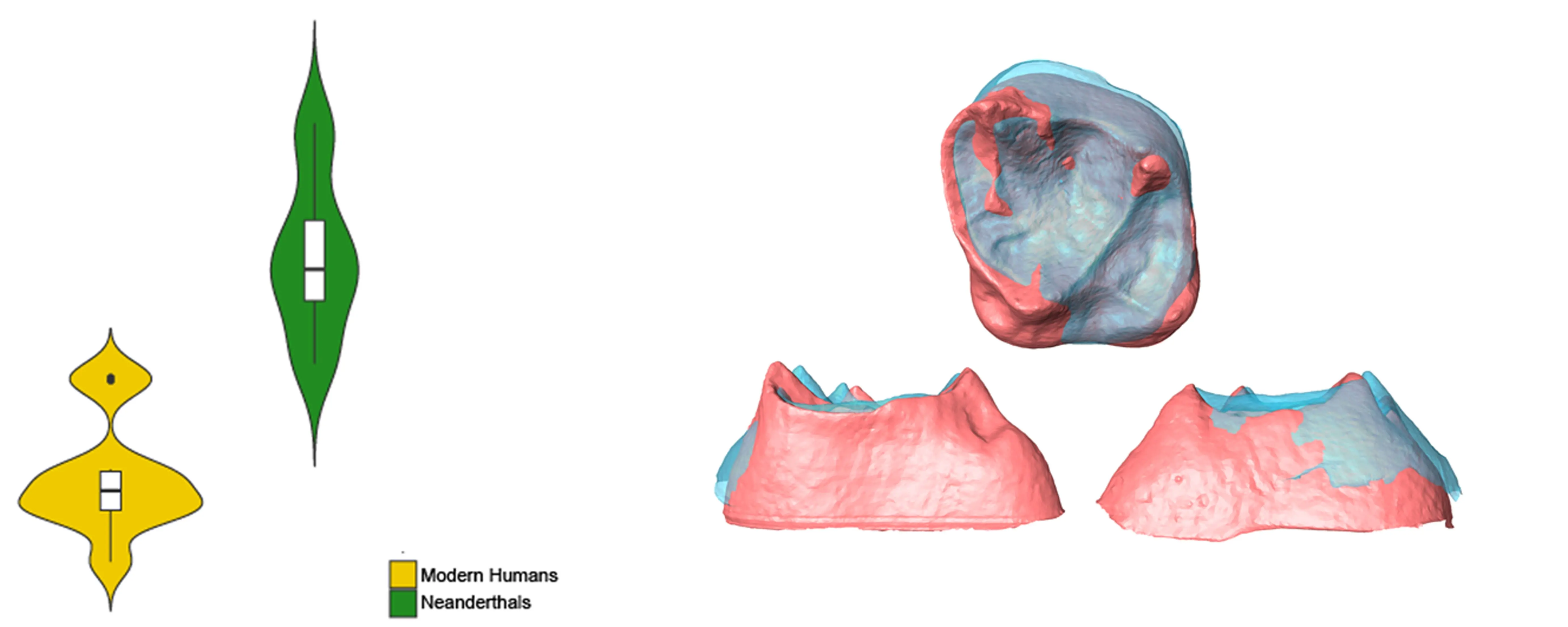 Archaic and modern humans differ in a range of craniodental features. From a taxonomic and phylogenetic perspective, it is essential to distinguish between species accurately through detailed morphological characterizations. This study analyzes the size and shape variation of the enamel-dentine junction (EDJ) of upper molars from two hominin species, early Neanderthals from Krapina (N = 13) and mid-Holocene European modern humans (N = 14), to assess the extent of their endostructural morphological differentiation. The EDJ was obtained through microtomographic scans of each molar using segmentation procedures. Three-dimensional landmarks semilandmarks and 3D geometric morphometric methods, were employed to investigate EDJ size and shape variation through univariate (t-test), multivariate exploratory, and classification methods (PCA and LDA). The results indicate that the shape of the EDJ and cervix of M2 differentiates Krapina Neanderthals from mid-Holocene European modern humans with a high degree of accuracy (~85%). Furthermore, EDJ size and dental nonmetric traits expressed in this structure provide additional information that is useful for distinguishing between the two species. Compared to modern humans, Krapina Neanderthals exhibit reduced dental diversity. From an endostructural perspective, this study provides additional insights into early Neanderthals’ morphological diversification relative to modern humans, which is valuable for studying middle and late Pleistocene hominin evolution.