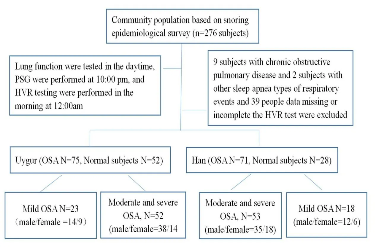 The aim of the study was to compare Hypoxic Ventilatory Response (HVR) of sleep apnea in Uygur patients stemming from higher altitude and Chinese Han patients from sea level. 276 subjects with or without snoring from the Karamay community were recruited. 226 subjects (n = 71 Han OSA patients, n = 75 Uygur OSA patients, n = 52 for Uygur control subjects without OSA, n = 28 Han control subjects without OSA) were matched for age and gender. All patients were assessed via polysomnography (PSG). Lung function was assessed. Apnea-hypopnea index (AHI), mean SaO2 (MSaO2%), lowest SaO2 (LSaO2%), the number of desaturations ≥4% per hour (ODI4), FEV1/FVC ratio, HVR, △VE/△SaO2 and the pulse responses to hypoxia changes (ΔPulse/ΔSaO2) were calculated. A multiple logistic regression using a binary outcome for HVR was applied. (1) In control subjects without OSA, those living at high altitude (Uygur) had a lower HVR than control subjects living at sea level (Han) [−0.35L·min−1 per %SpO2(−0.49 to−0.20 L·min−1 per %SpO2) vs.−0.44 L·min−1 per %SpO2(−0.55 to −0.21 L·min−1 per %SpO2)]. (2) Compared to patients with OSA living at sea level (Han), those OSA patients living at high altitude (Uygur) had a higher neck circumference [43 cm (range 39–45 cm) vs. 42 cm (41–46) cm], higher abdominal circumference [110 cm (102–120 cm) vs. 101 cm (98–111 cm], higher LSaO2 [81% (72–85%) vs. 76% (68–81%)], lower AHI [26 events/h (16–43 events/h) vs. 36 events/h (24–62 events/h)] and lower ODI4 [15/h (7–29/h) vs. 37/h (20–54/h)]. (3) Considering patients with mild OSA, those who lived at high altitude (Uygur) had a weaker HVR compared to Han patients [−0.31 L·min−1 per %SpO2(−0.42 to −0.20 L·min−1 per %SpO2) vs.−0.47 L·min−1 per %SpO2(−0.59 to −0.21 L·min−1 per %SpO2)]. However, in moderate and severe OSA the difference in HVR between people living at high and low altitudes was not significant. In people living at high altitude (Uygur) compared to sea level (Han), HVR is weaker both in control subjects and those with mild OSA, but this difference between populations living at different altitudes in those with moderate and severe OSA is not obvious.