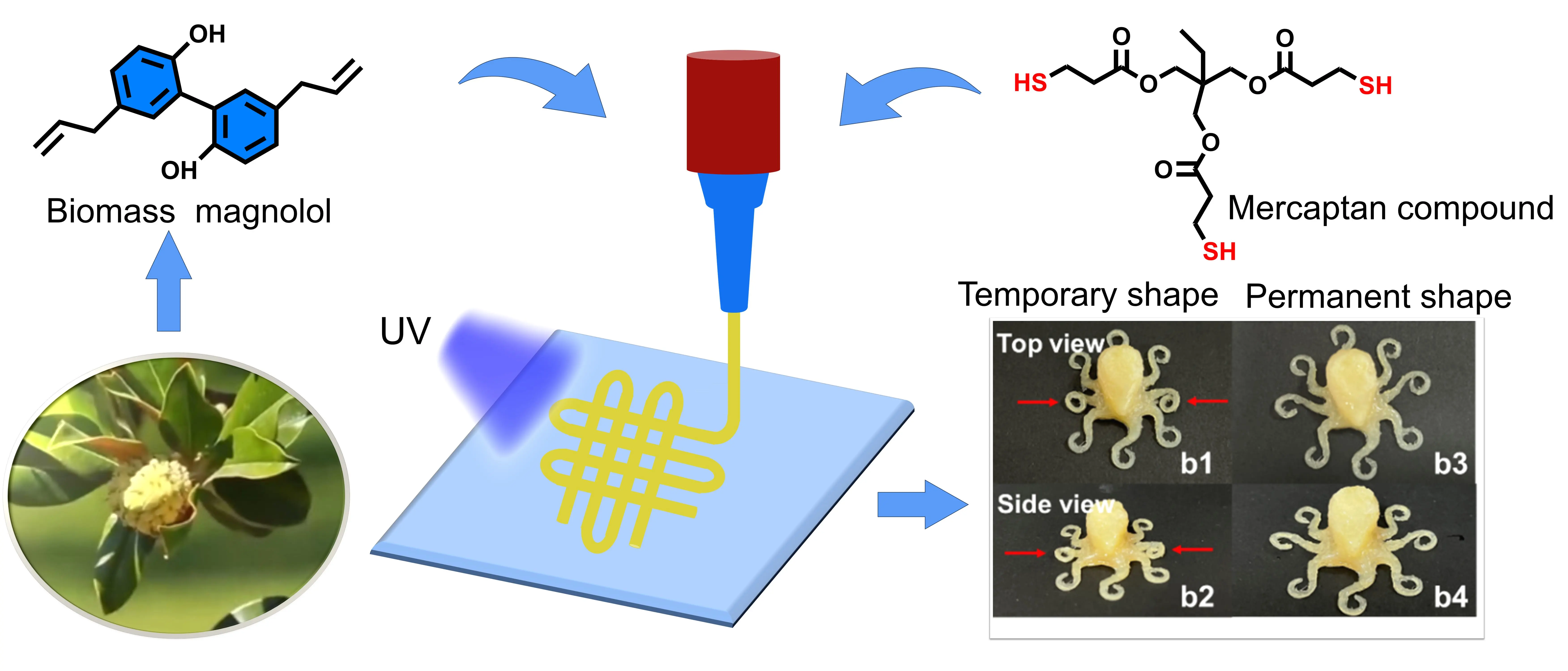 The rapid development of 3D printing, also known as additive manufacturing, has opened up new opportunities for applying shape memory polymers (SMPs) in various fields. The use of abundant, inexpensive, and easily accessible biomass materials as printing raw materials not only facilitates the creation of more intricate SMPs but also aligns with the principles of low-carbon, green, and sustainable development. Here, we successfully printed a shape memory cross-linked network (NW-MO-TTMP) in a single step by direct-ink-writing printing and an in-situ thiol-ene click reaction with magnolol and trimethylolpropane tris(3-mercaptopropionate) as raw materials. The resulting NW-MO-TTMP network exhibited high mechanical properties and a tensile strength (σ) of up to 2.7 MPa when the thiol-ene ratio was 1.0:1, and the photo-initiator content was 1.5%. To improve printability, ethyl cellulose (EC) derived from biomass was incorporated to enhance the viscosity of the printing precursor fluid, resulting in a significant increase in the σ of the NW-MO-TTMP/EC network, reaching 20.6 MPa. Moreover, the successful printing of intricate models, such as the ‘whale’ and ‘octopus,’ demonstrated excellent shape memory effects. This approach highlights the potential of combining biomass-derived materials with advanced 3D printing techniques to develop sustainable and high-performance SMPs.